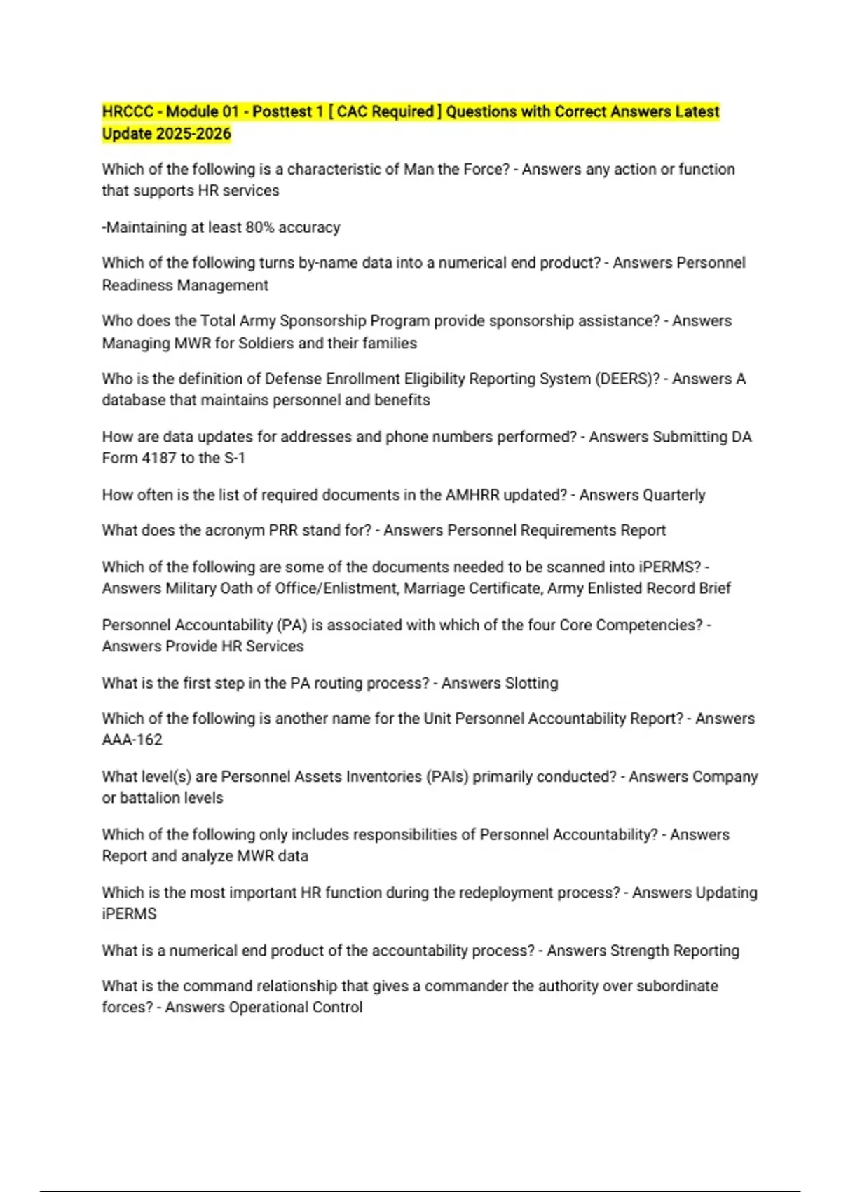 HRCCC - Module 01 - Posttest 1 [ CAC Required ] Questions with Correct Answers Latest Update Which of the following is a characteristic of Man the Force? - Answers any action or function that supports HR services -Maintaining at least 80% accuracy Which of the following turns by-name data into a numerical end product? - Answers Personnel Readiness Management Who does the Total Army Sponsorship Program provide sponsorship assistance? - Answers Managing MWR for Soldiers and their families Who is the definition of Defense Enrollment Eligibility Reporting System (DEERS)? - Answers A database that maintains personnel and benefits How are data updates for addresses and phone numbers performed? - Answers Submitting DA Form 4187 to the S-1 How often is the list of required documents in the AMHRR updated? - Answers Quarterly What does the acronym PRR stand for? - Answers Personnel Requirements Report Which of the following are some of the documents needed to be scanned into iPERMS? - Answers Military Oath of Office/Enlistment, Marriage Certificate, Army Enlisted Record Brief Personnel Accountability (PA) is associated with which of the four Core Competencies? - Answers Provide HR Services What is the first step in the PA routing process? - Answers Slotting Which of the following is another name for the Unit Personnel Accountability Report? - Answers AAA-162 What level(s) are Personnel Assets Inventories (PAIs) primarily conducted? - Answers Company or battalion levels Which of the following only includes responsibilities of Personnel Accountability? - Answers Report and analyze MWR data Which is the most important HR function during the redeployment process? - Answers Updating iPERMS What is a numerical end product of the accountability process? - Answers Strength Reporting What is the command relationship that gives a commander the authority over subordinate forces? - Answers Operational Control