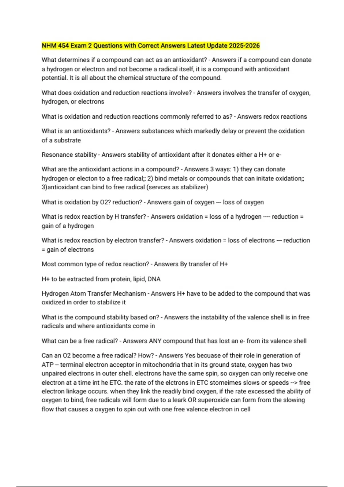 NHM 454 Exam 2 Questions with Correct Answers Latest Update What determines if a compound can act as an antioxidant? - Answers if a compound can donate a hydrogen or electron and not become a radical itself, it is a compound with antioxidant potential. It is all about the chemical structure of the compound. What does oxidation and reduction reactions involve? - Answers involves the transfer of oxygen, hydrogen, or electrons What is oxidation and reduction reactions commonly referred to as? - Answers redox reactions What is an antioxidants? - Answers substances which markedly delay or prevent the oxidation of a substrate Resonance stability - Answers stability of antioxidant after it donates either a H+ or e- What are the antioxidant actions in a compound? - Answers 3 ways: 1) they can donate hydrogen or electon to a free radical;; 2) bind metals or compounds that can initate oxidation;; 3)antioxidant can bind to free radical (servces as stabilizer) What is oxidation by O2? reduction? - Answers gain of oxygen --- loss of oxygen What is redox reaction by H transfer? - Answers oxidation = loss of a hydrogen ---- reduction = gain of a hydrogen What is redox reaction by electron transfer? - Answers oxidation = loss of electrons --- reduction = gain of electrons Most common type of redox reaction? - Answers By transfer of H+ H+ to be extracted from protein, lipid, DNA Hydrogen Atom Transfer Mechanism - Answers H+ have to be added to the compound that was oxidized in order to stabilize it What is the compound stability based on? - Answers the instability of the valence shell is in free radicals and where antioxidants come in What can be a free radical? - Answers ANY compound that has lost an e- from its valence shell Can an O2 become a free radical? How? - Answers Yes becuase of their role in generation of ATP -- terminal electron acceptor in mitochondria that in its ground state, oxygen has two unpaired electrons in outer shell. electrons have the same spin, so oxygen can only receive one electron at a time int he ETC. the rate of the elctrons in ETC stomeimes slows or speeds --> free electron linkage occurs. when they link the readily bind oxygen, if the rate excessed the ability of oxygen to bind, free radicals will form due to a leark OR superoxide can form from the slowing flow that causes a oxygen to spin out with one free valence electron in cell How much of oxygen results in production of reactive oxygen species? - Answers 2-5% of oxygen in gneeration of ATP What is a source of oxidative stress? Why? Quenches this stress? - Answers exercise is a source of oxidative stress due to increase O2 intake --- food quenches it What is superoxide? - Answers an oxygen that became a free radical due to the unpaired valence electron in its outer cell What is ROS? - Answers reactive oxidative species free radicals containing O2 (w/ unpaired e- in outer shell) are strong oxidants and can be beneficial detrimental at high levels What are examples of ROS? - Answers hydroxyl radical, singlet oxygen, hydrogen peroxide, peroxyl radical, etc. What does excess ROS do? - Answers overwhelms protective enzymes resulting in oxidative stress (destroying tissues/disrupting DNA) What is the most potent radical? - Answers oxygen What are endogenous antioxidant enzymes? - Answers superoxide dismutase gluathione peroxidase catalase glutathone reductase *produced based on amnt of BASAL oxidative stress* What were endogenous antioxidant enzymes created for? - Answers By body to: -quench the radicals created to aeorbic respiration -detoxify/breakdown oxidative species What causes disease onset? - Answers increase oxidative stress and inadequate diet What are endogenous source for free radicals? - Answers aerobic respiration peroxisomes cytochrome P450 phagocytic cells (these sources cant be avoided and diet must compensate) What do peroxisomes do? - Answers breaks down fatty acids How do peroxisomes create free radicals? - Answers produce hydrogen peroxide as by product of breakdown of FA (endogenous source) What do cytochrome P450? - Answers primary defense against toxins How does cytochrome P450 create free radicals? - Answers produces ROS when up-regulated and attempting to detoxify body from toxins ROS will breakdown toxins but some ROS gets lost and adds to oxidative stress (endogenous source) What do phagocytic cells do? - Answers cells that are eating/destroying invading virus/bacteria cells How do phagocytic cells produce free radicals? - Answers Generates ROS to help rid body of invading virus/bacteria (endogenous source) What are exogenous sources of free radicals? - Answers smoking diet (grilling, transition metals*) radiation (UVA) exercise and high O2 tenison xenobiotics (toxins we consume) *transition metals iron/copper have ability to steal e- and cause oxidative stress* What can become oxidized? more likely? - Answers any organic compound can be but generally it is lipids due to saturation or unsaturation levels, proteins, and DNA What do free radicals reults in cellular damage to? - Answers oxidizable substrates
