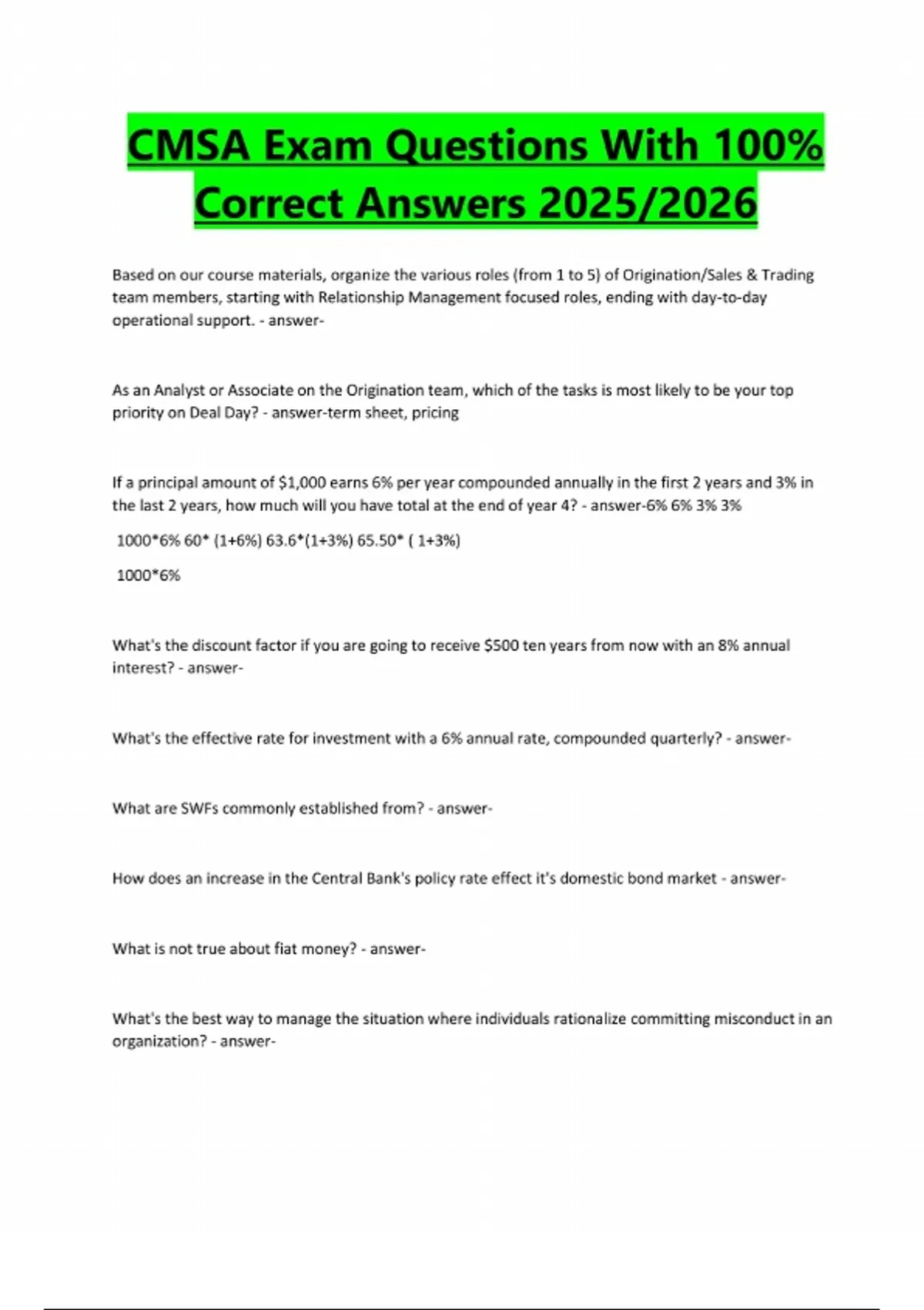 CMSA Exam Questions With 100% Correct Answers 2025/2026 Based on our course materials, organize the various roles (from 1 to 5) of Origination/Sales & Trading team members, starting with Relationship Management focused roles, ending with day-to-day operational support. - answerAs an Analyst or Associate on the Origination team, which of the tasks is most likely to be your top priority on Deal Day? - answer-term sheet, pricing If a principal amount of $1,000 earns 6% per year compounded annually in the first 2 years and 3% in the last 2 years, how much will you have total at the end of year 4? - answer-6% 6% 3% 3% 1000*6% 60* (1+6%) 63.6*(1+3%) 65.50* ( 1+3%) 1000*6% What's the discount factor if you are going to receive $500 ten years from now with an 8% annual interest? - answerWhat's the effective rate for investment with a 6% annual rate, compounded quarterly? - answerWhat are SWFs commonly established from? - answerHow does an increase in the Central Bank's policy rate effect it's domestic bond market - answerWhat is not true about fiat money? - answerWhat's the best way to manage the situation where individuals rationalize committing misconduct in an organization? - answerIf a company declares bankruptcy, what is the correct order of how stakeholders are paid out (from first to last)? - answerWhat is the spread for this security after an investor submits a sell order for 185 shares at $41.87? - answer