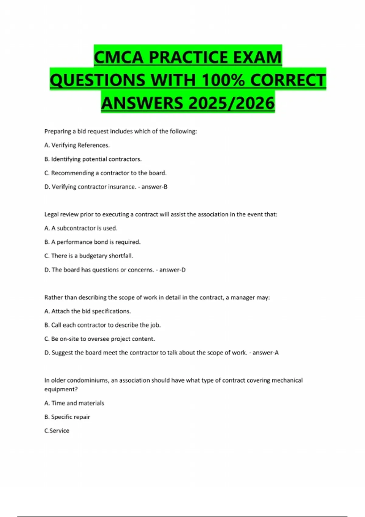 CMCA PRACTICE EXAM QUESTIONS WITH 100% CORRECT ANSWERS 2025/2026 Preparing a bid request includes which of the following: A. Verifying References. B. Identifying potential contractors. C. Recommending a contractor to the board. D. Verifying contractor insurance. - answer-B Legal review prior to executing a contract will assist the association in the event that: A. A subcontractor is used. B. A performance bond is required. C. There is a budgetary shortfall. D. The board has questions or concerns. - answer-D Rather than describing the scope of work in detail in the contract, a manager may: A. Attach the bid specifications. B. Call each contractor to describe the job. C. Be on-site to oversee project content. D. Suggest the board meet the contractor to talk about the scope of work. - answer-A In older condominiums, an association should have what type of contract covering mechanical equipment? A. Time and materials B. Specific repair C.ServiceD. Preventative maintenance - answer-D For which project would a board most likely want to use a consultant to help develop bid specifications? A.Landscape renovation project B. Repairing and/or replacing roofs C. Painting the interior of lobbies and hallways D. Repairing HVAC and boilers - answer-B In what type of contract would a waiver of lien be recommended? A. Repair of the HVAC system B.Re-roofing the buildings C. Repair of the pool pump D. Annual tree pruning - answer-B In terms of compensation , a contract should state: A. Who provides insurance coverage B. Each employees rate to perform work C. When and on what terms payment(s) will be made D. Requirement for a payment bond - answer-C