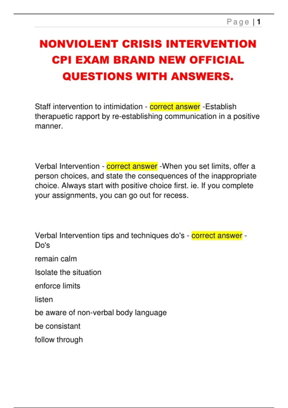 NONVIOLENT CRISIS INTERVENTION CPI EXAM BRAND NEW OFFICIAL QUESTIONS WITH ANSWERS.