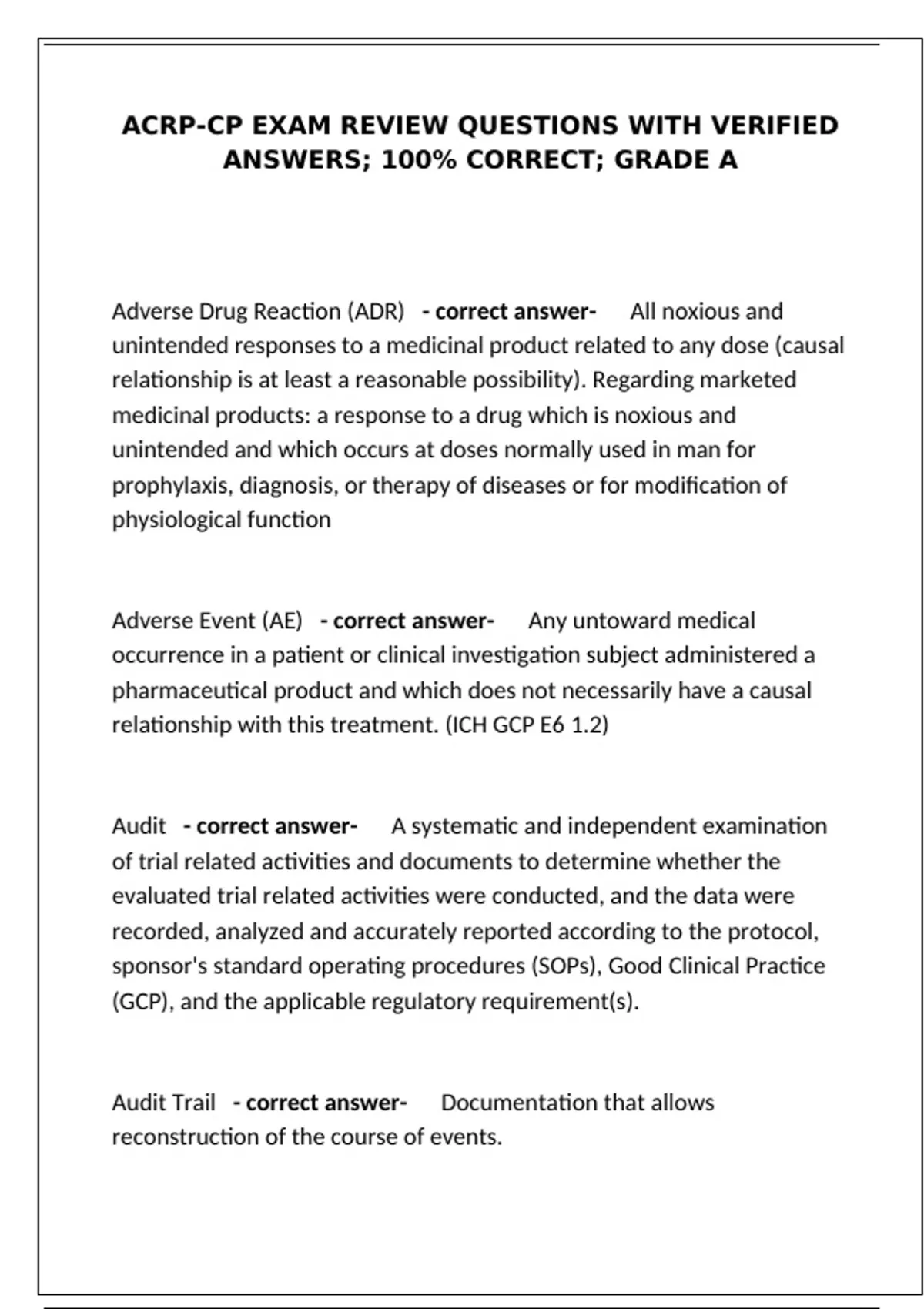 This document contains a full set of ACRP (Association of Clinical Research Professionals) practice test questions with verified answers, covering key Good Clinical Practice (GCP) and ICH guidelines. It includes realistic exam-style scenarios on topics such as informed consent, adverse event reporting, trial management, investigator responsibilities, and study phases. Designed to help candidates prepare effectively for the ACRP certification exam, this resource ensures 100% accuracy and a thorough understanding of clinical research operations.