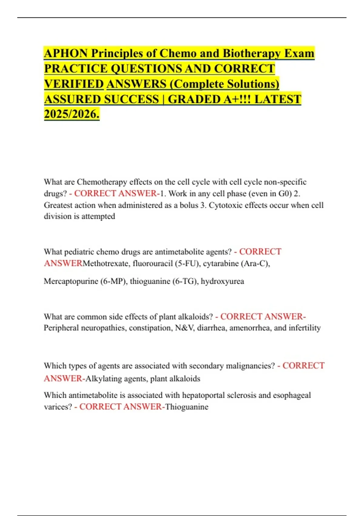 APHON Principles of Chemo and Biotherapy Exam PRACTICE QUESTIONS AND CORRECT VERIFIED ANSWERS (Complete Solutions) ASSURED SUCCESS | GRADED A+!!! LATEST 2025/2026. What are Chemotherapy effects on the cell cycle with cell cycle non-specific drugs? - CORRECT ANSWER-1. Work in any cell phase (even in G0) 2. Greatest action when administered as a bolus 3. Cytotoxic effects occur when cell division is attempted What pediatric chemo drugs are antimetabolite agents? - CORRECT ANSWERMethotrexate, fluorouracil (5-FU), cytarabine (Ara-C), Mercaptopurine (6-MP), thioguanine (6-TG), hydroxyurea What are common side effects of plant alkaloids? - CORRECT ANSWERPeripheral neuropathies, constipation, N&V, diarrhea, amenorrhea, and infertility Which types of agents are associated with secondary malignancies? - CORRECT ANSWER-Alkylating agents, plant alkaloids Which antimetabolite is associated with hepatoportal sclerosis and esophageal varices? - CORRECT ANSWER-Thioguanine Define neoadjuvant chemotherapy - CORRECT ANSWER-When chemo is used preoperatively to decrease tumor burden in order to make it easier to remove the tumor surgically.