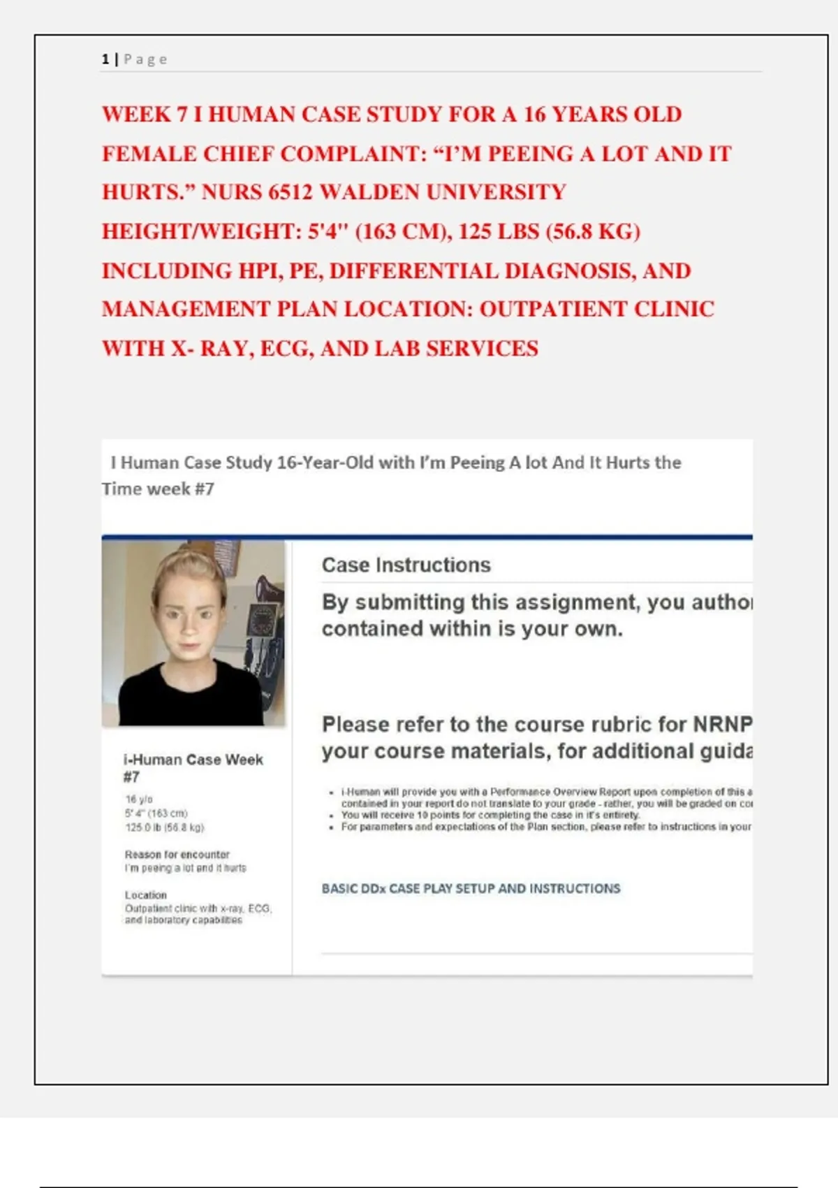 WEEK 7 I HUMAN CASE STUDY FOR A 16 YEARS OLD FEMALE CHIEF COMPLAINT: “I’M PEEING A LOT AND IT HURTS.” NURS 6512 WALDEN UNIVERSITY HEIGHT/WEIGHT: 5'4" (163 CM), 125 LBS (56.8 KG) INCLUDING HPI, PE, DIFFERENTIAL DIAGNOSIS, AND MANAGEMENT