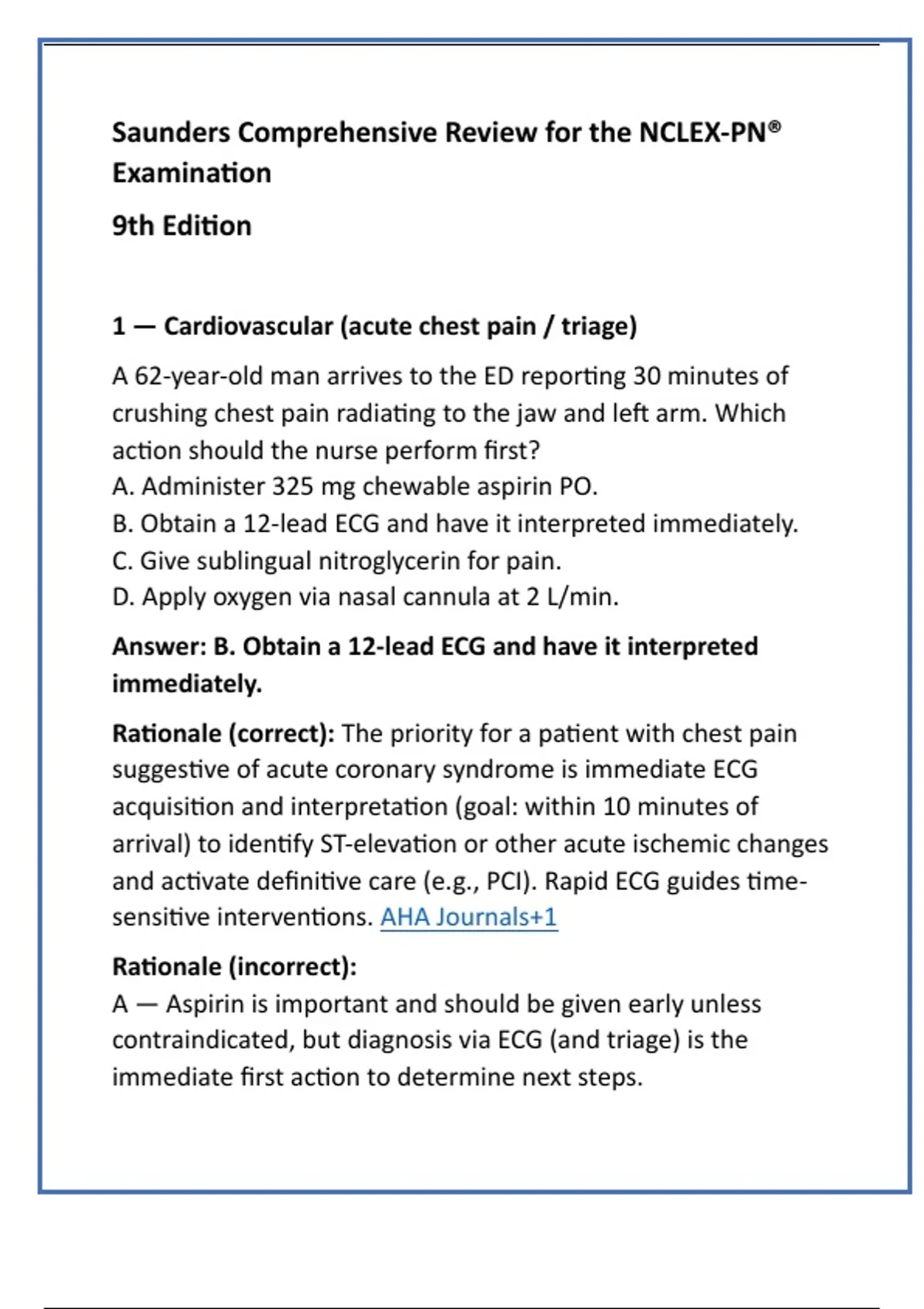 Rationale (correct): The priority for a patient with chest pain