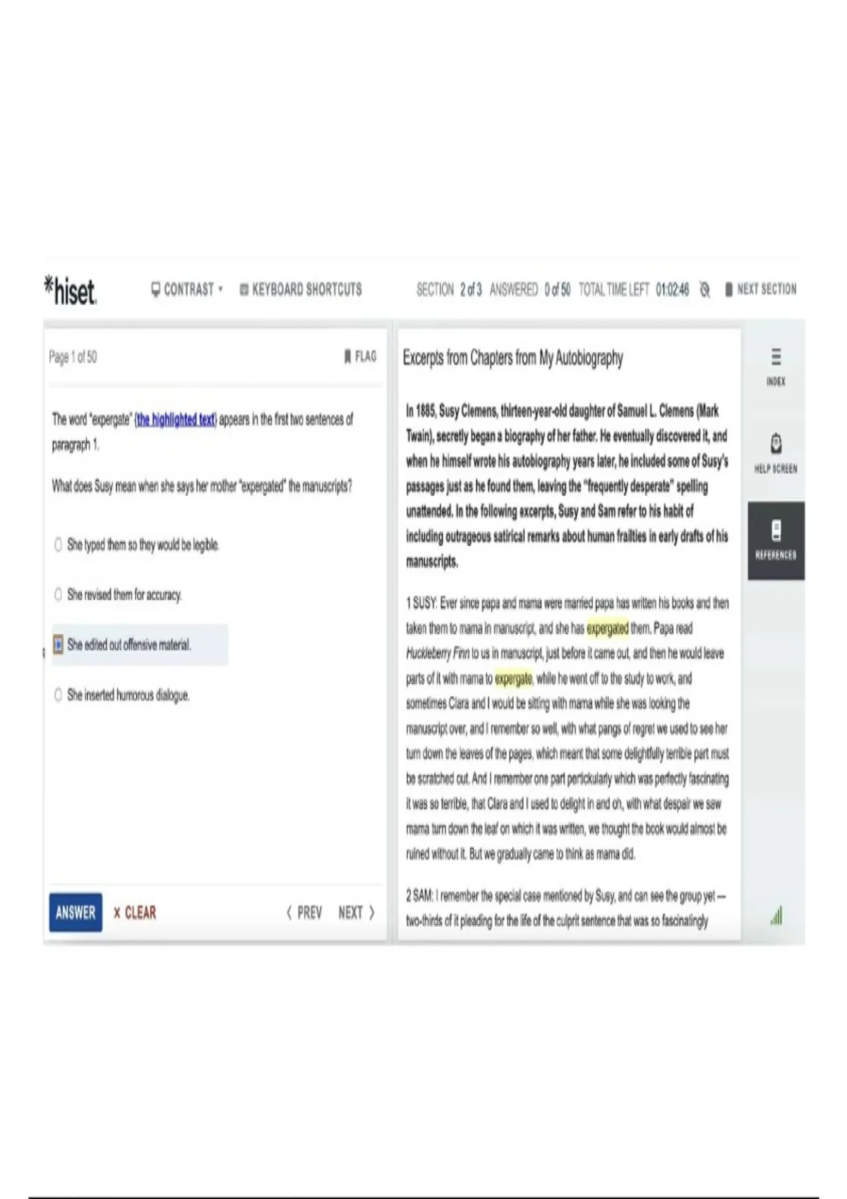 This document is a comprehensive 50-page practice test for the English Language Arts section of the High School Equivalency Test (HiSET). It is designed to provide realistic exam preparation, mirroring the format, content, and difficulty of the actual HiSET exam. The practice test features a wide variety of reading passages and corresponding multiple-choice questions that assess critical reading comprehension, analysis, and reasoning skills. Key areas of focus and the included literary works are: > Literary Analysis: Excerpts from Mark Twain's autobiography, Chapters from My Autobiography, exploring family dynamics, editing processes, and authorial voice. > Informational Texts: A passage from D.H. Lawrence's Twilight in Italy, focusing on descriptive language, narrative perspective, and the experience of navigating an unfamiliar environment. > Persuasive Writing: A "Letter to the Editor" arguing for changes in local arts coverage, ideal for analyzing argument structure, tone, and author's purpose. > Historical & Technical Documents: A Smithsonian Institution report on "Navajo Weavers," detailing historical weaving techniques, material use, and cultural comparisons. > Modern Informational Texts: Passages on the "Merits of Community Colleges," discussing benefits like cost, flexibility, and academic support. > Contemporary Nonfiction: Two paired passages—"Amsterdam's Bicycle Claw" and "Sunken Treasure"—that allow for comparative analysis of problem-solving, retrieval methods, and the value of submerged objects. This resource is ideal for: - Individuals preparing to take the HiSET exam. - Adult education students and instructors seeking high-quality, formal practice materials. - Anyone looking to improve their reading comprehension, vocabulary, and analytical skills for high-school equivalency.