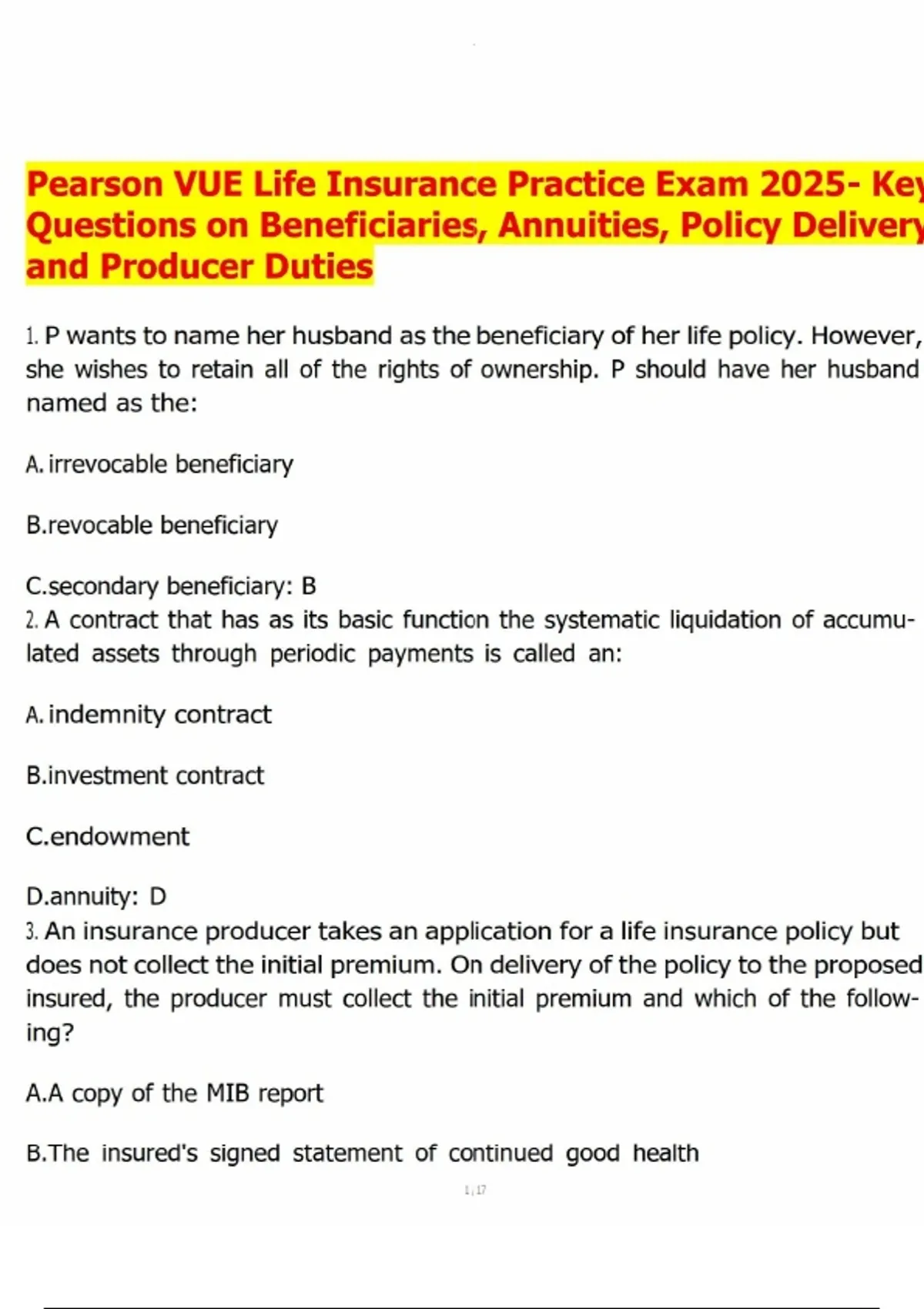 Pearson VUE Life Insurance Practice Exam 2025- Key Questions on Beneficiaries, Annuities, Policy Delivery, and Producer Duties.pdf