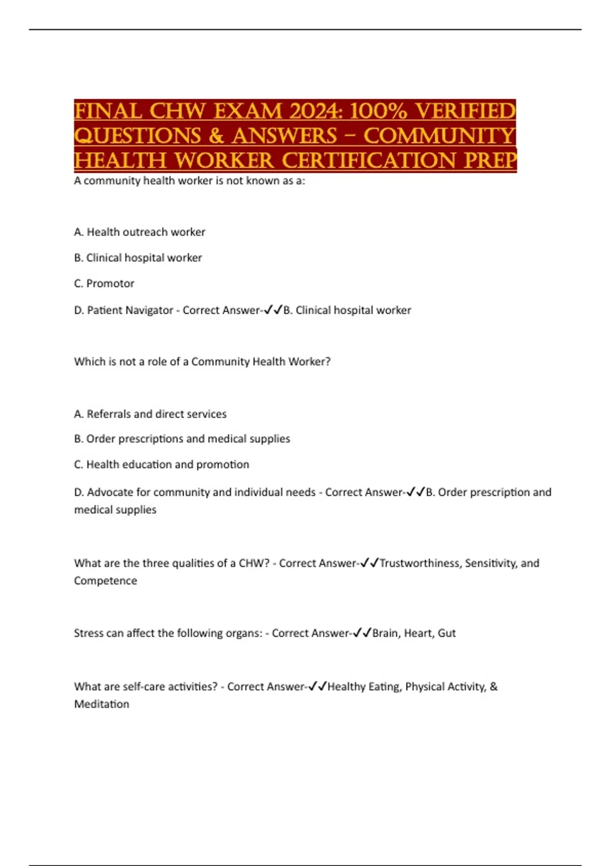 FINAL CHW EXAM 2024: 100% Verified Questions & Answers – Community Health Worker Certification Prep A community health worker is not known as a: A. Health outreach worker B. Clinical hospital worker C. Promotor D. Patient Navigator - Correct Answer-B. Clinical hospital worker Which is not a role of a Community Health Worker? A. Referrals and direct services B. Order prescriptions and medical supplies C. Health education and promotion D. Advocate for community and individual needs - Correct Answer-B. Order prescription and medical supplies What are the three qualities of a CHW? - Correct Answer-Trustworthiness, Sensitivity, and Competence Stress can affect the following organs: - Correct Answer-Brain, Heart, Gut What are self-care activities? - Correct Answer-Healthy Eating, Physical Activity, & Meditation Health inequalities can be defined as: - Correct Answer-Differences in health status between populations that are avoidable and preventable The social determinants of health include: - Correct Answer-Income, Employment, Education What three are government-funded health insurance programs? - Correct Answer-Medicaid, Childhood Health Insurance Program (CHIP), and Medicare Which of the following is not part of the Socioecological Model? A. Individual, Interpersonal, Organizational, Community, Public Policy B. Individual, Family, Friends, Classmates, Neighborhood C. Individual, City, County, State, Country D. Individual, Family, Community, Business, Public Policy - Correct Answer-A. Individual, Interpersonal, Organizational, Community, Public Policy