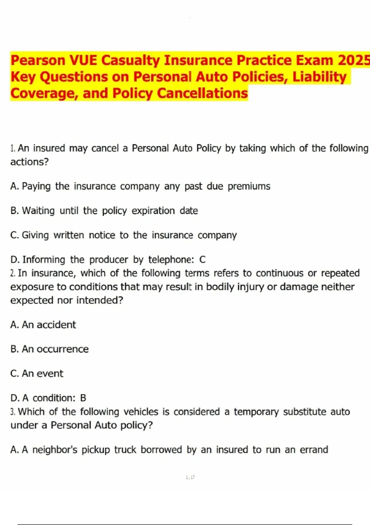Pearson VUE Casualty Insurance Practice Exam 2025- Key Questions on Personal Auto Policies, Liability Coverage, and Policy Cancellations.pdf