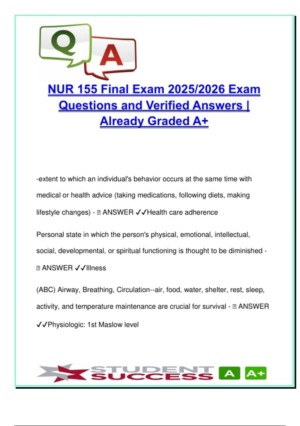 This document includes 100 thoroughly verified and graded questions with answers from the NUR 155 Final Exam – Fundamentals of Nursing, prepared for the 2025/2026 academic year. It serves as a complete and high-yield resource, offering deep coverage of core nursing concepts essential for passing finals, clinical assessments, and licensure exams such as the NCLEX. It emphasizes critical foundational knowledge across multiple domains, including: – Maslow’s Hierarchy of Needs and levels of prevention (primary, secondary, tertiary) for holistic client care – Growth and development health education by age group, from infancy to older adulthood – Fluid and electrolyte balance: lab values, signs/symptoms of imbalances, and nursing interventions – Infection prevention and control: C. diff precautions, hand hygiene, PPE, standard precautions – Vital signs and normal ranges, including temperature, BP, HR, O2 saturation, and RR – Therapeutic communication techniques, SBAR structure, and open-ended questioning strategies – Pain management and opioid safety, pain scales, types of pain, and non-pharmacologic relief strategies – Sensory function and alteration care: sensory overload/deprivation, safe environment adaptation – Wound healing stages and pressure injury classification, including primary, secondary, and tertiary healing – Oxygen delivery systems and respiratory assessment, including nasal cannula, face mask, BIPAP/CPAP – Nutrition and vitamins: recommended daily values and associated health benefits – Medication administration: rights, checks, dosage routes (oral, parenteral, topical), and safety protocols – Ethical and legal principles in nursing: autonomy, beneficence, justice, fidelity, and cultural competence – End-of-life care and grief: Kübler-Ross stages, palliative interventions, and spiritual considerations With broad topical coverage and structured Q&A format, this document is ideal for nursing students seeking mastery of fundamental nursing skills and clinical reasoning. It aligns well with concept-based curricula and supports real-world nursing scenarios. Recommended for students in: – NUR 155 or equivalent Fundamentals of Nursing courses – Associate Degree in Nursing (ADN) – Bachelor of Science in Nursing (BSN) – LPN to RN bridge programs – NCLEX-RN and NCLEX-PN exam preparation Keywords: maslow hierarchy,fluid balance,electrolyte values,pain management,nursing process,SBAR communication,therapeutic communication,wound healing,standard precautions,oxygen devices,nursing ethics,cultural competence,medication administration,nursing documentation,grief stages,nursing education,nutritional vitamins,vital signs,patient safety,delegation
