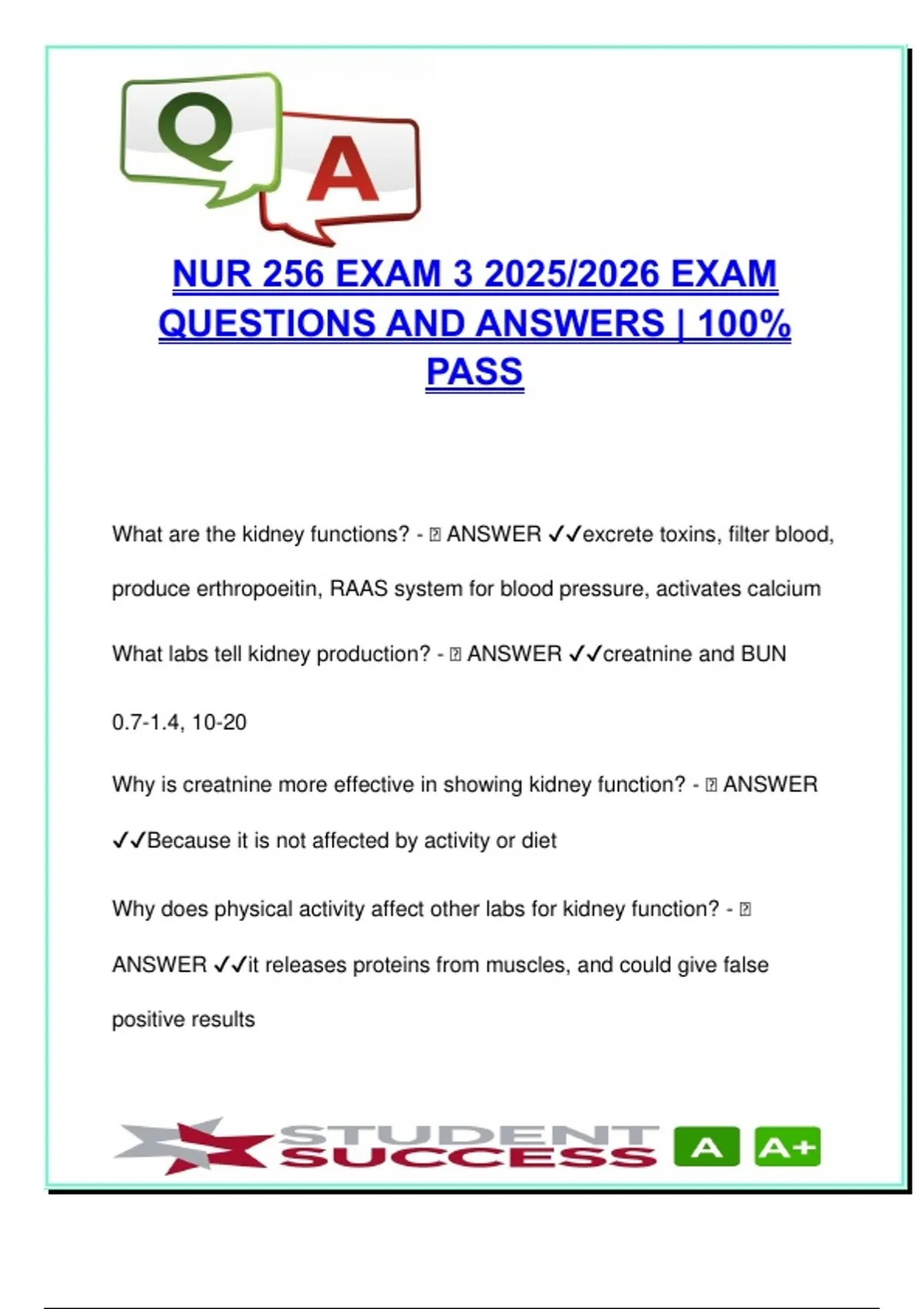 This expertly structured document contains 100 verified exam questions and answers for NUR 256: Medical-Surgical Nursing, specifically covering renal, urological, gastrointestinal, and endocrine content for the 2025–2026 academic year at Nursing School USA. It serves as a complete and high-yield study guide for nursing students preparing for Exam 3. Core topics include kidney function, urine diagnostic testing, and detailed comparisons between acute kidney injury (AKI) and chronic kidney disease (CKD). The guide explains procedures like 24-hour urine collection, clean catch, and creatinine clearance, alongside treatments such as hemodialysis and peritoneal dialysis—with in-depth content on AV fistulas, peritoneal phases, dialysis complications, and safety protocols. In the gastrointestinal section, students will find concise explanations of upper and lower GI anatomy, diagnostic tests (e.g., colonoscopy, barium swallow, EGD, liver biopsy), and GI ulcer types (gastric, duodenal), including risk factors like H. pylori and medications such as PPIs, H2 blockers, and mucosal healing agents. Complex GI topics such as dumping syndrome, gastrectomy procedures (Billroth I & II), bowel obstructions, and fecal occult testing are covered in detail. The final sections delve into Inflammatory Bowel Diseases (IBD), with direct comparisons between Crohn’s Disease and Ulcerative Colitis, including hallmark symptoms, diagnostic differences, and interventions. This document is ideal for: – Nursing students in ADN, ASN, BSN, and accelerated nursing programs – Learners enrolled in Medical-Surgical Nursing, Renal Nursing, GI Nursing, or Advanced Adult Health courses – Candidates preparing for NCLEX-RN, HESI, or ATI assessments Whether you're studying renal function, preparing for GI diagnostics, or mastering dialysis protocols, this resource delivers a complete and focused review to enhance your exam success and clinical readiness. Keywords: renal function, kidney labs, creatinine clearance, clean catch urine, UTIs, dialysis, peritoneal dialysis, hemodialysis, AKI, CKD, GI disorders, ulcer types, dumping syndrome, Billroth procedure, liver biopsy, colonoscopy, fecal occult blood test, Crohn’s disease, ulcerative colitis, bowel obstruction, medical surgical nursing, NCLEX prep