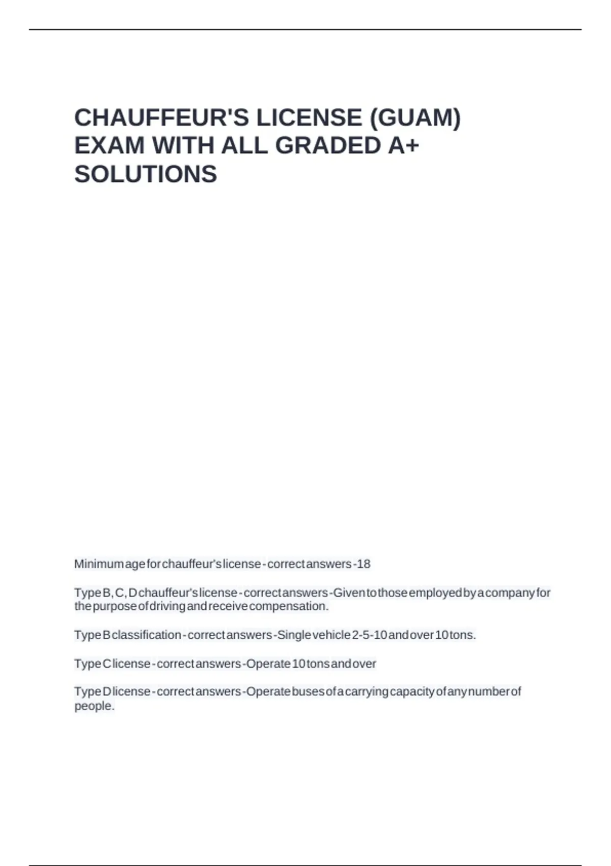 Type B, C, D chauffeur's license - correct answers -Given to those employed by a company for