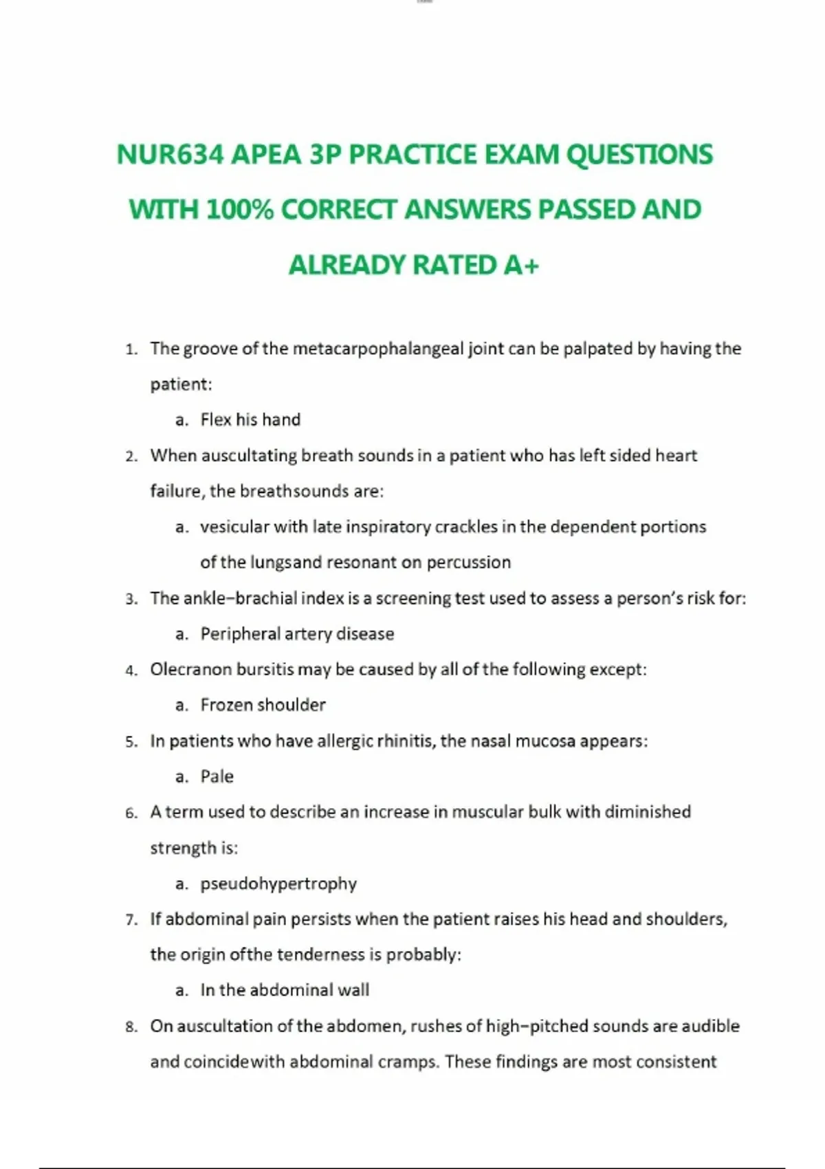 The NUR634 APEA 3P Practice Exam Questions with 100% Correct Answers – Passed and Already Rated A+ is a verified, high-quality study resource created for advanced practice nursing students preparing for the APEA 3P Exam. Covering the three essential domains of Pathophysiology, Pharmacology, and Physical Assessment, this practice exam provides an accurate, exam-style experience to help learners succeed on predictor and certification exams. With 100% verified correct answers, students can prepare with confidence, knowing that each question is accurate and evidence-based. Updated for the 2025/2026 testing cycle, this exam aligns with the latest guidelines and incorporates NGN-style clinical judgment questions to enhance critical thinking and decision-making skills. Key Features: Realistic practice exam modeled after the APEA 3P. Comprehensive coverage of adult health pathophysiology, pharmacologic management, and advanced assessment. Clinical case scenarios that develop diagnostic reasoning and prioritization. Evidence-based rationales for every correct answer to reinforce understanding. Rated A+ by past users for accuracy and reliability. This practice exam is perfect for FNP, AGNP, PMHNP, and APRN students who want a proven way to assess readiness, identify knowledge gaps, and improve exam performance. Whether used for independent study or alongside an APEA review course, it delivers the knowledge and confidence needed to excel. Edition Details: Title: NUR634 APEA 3P Practice Exam Questions with 100% Correct Answers Edition: Updated 2025/2026 Format: Digital Exam (Verified & Rated A+) Rating: ★★★★★ 1. The groove of the metacarpophalangeal joint can be palpated by having the patient: a. Flex his hand 2. When auscultating breath sounds in a patient who has left sided heart failure, the breath sounds are: a. vesicular with late inspiratory crackles in the dependent portions of the lungs and resonant on percussion 3. The ankle−brachial index is a screening test used to assess a person’s risk for: a. Peripheral artery disease 4. Olecranon bursitis may be caused by all of the following except: a. Frozen shoulder 5. In patients who have allergic rhinitis, the nasal mucosa appears: a. Pale 6. A term used to describe an increase in muscular bulk with diminished strength is: a. pseudohypertrophy 7. If abdominal pain persists when the patient raises his head and shoulders, the origin of the tenderness is probably: a. In the abdominal wall 8. On auscultation of the abdomen, rushes of high−pitched sounds are audible and coincide with abdominal cramps. These findings are most consistent with: a. Intestinal obstruction 9. Ophthalmoscopic examination of the fundus reveals tiny, round, red spots in and around the macular area. These findings are consistent with: a. Microaneurysms