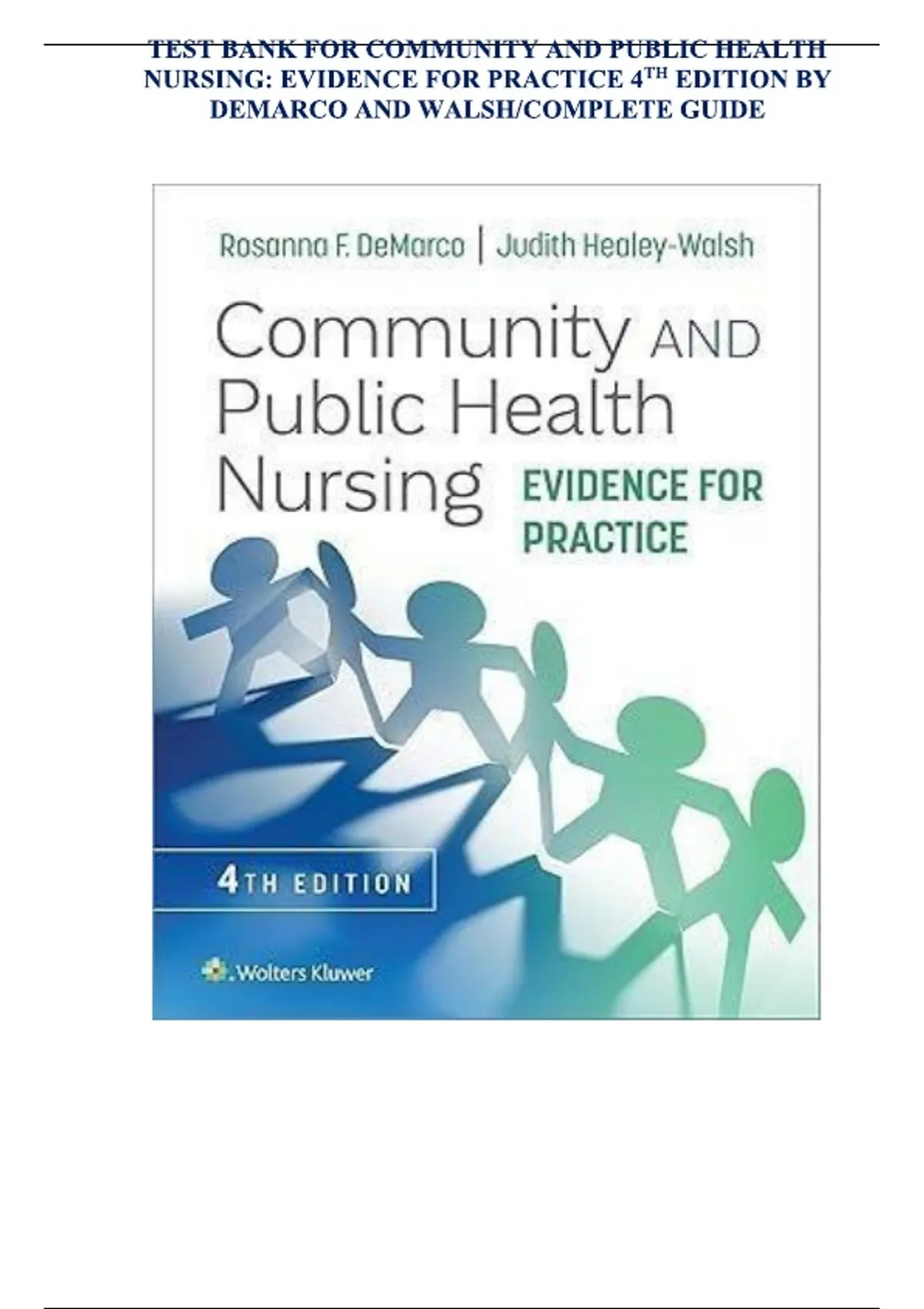 INSTANT PDF DOWNLOAD — This complete test bank for Community and Public Health Nursing: Evidence for Practice (4th Edition) by Rosanna DeMarco and Judith Healey-Walsh offers a full collection of multiple-choice, case-based, and application-style questions with detailed answers and rationales. Developed to align perfectly with the 4th edition textbook, it covers all chapters and provides an in-depth review of the principles, models, and evidence-based practices in community and public health nursing. Key topics include population health, epidemiology, health promotion, disease prevention, social determinants of health, vulnerable populations, health policy, disaster preparedness, and community assessment. This resource is ideal for BSN, MSN, and DNP students preparing for classroom exams, clinical rotations, or certification boards. It enhances understanding of nursing roles, ethical responsibilities, and collaborative strategies in community and global health care.