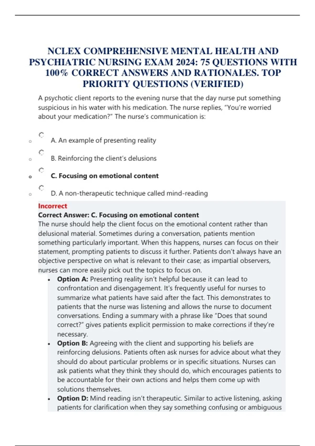 • Option D: Mind reading isn’t therapeutic. Similar to active listening, asking