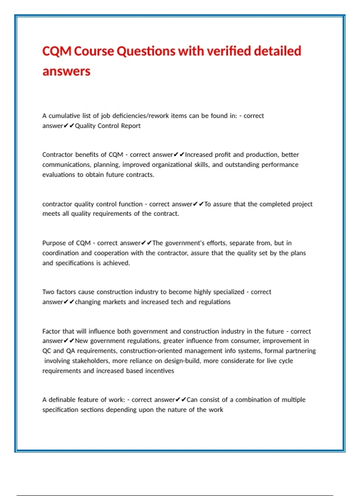 CQM Course Questions with verified detailed answers