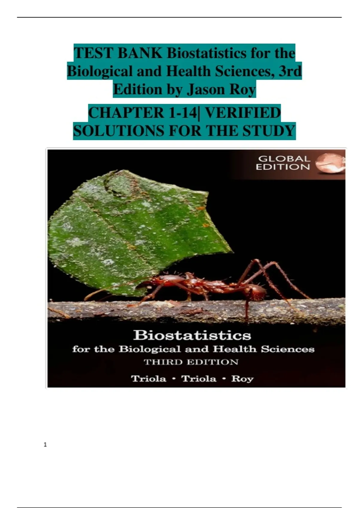 This document contains the complete Test Bank for Biostatistics for the Biological and Health Sciences, 3rd Edition by Jason Roy. It includes chapters 1–14, each with multiple-choice questions, verified correct answers, and detailed rationales. Topics cover the core areas of biostatistics including types of data, sampling methods, data visualization, measures of central tendency and dispersion, probability, hypothesis testing, correlation, and regression. This test bank is ideal for exam preparation, practice, or self-assessment in courses related to biostatistics for health and biological sciences.
