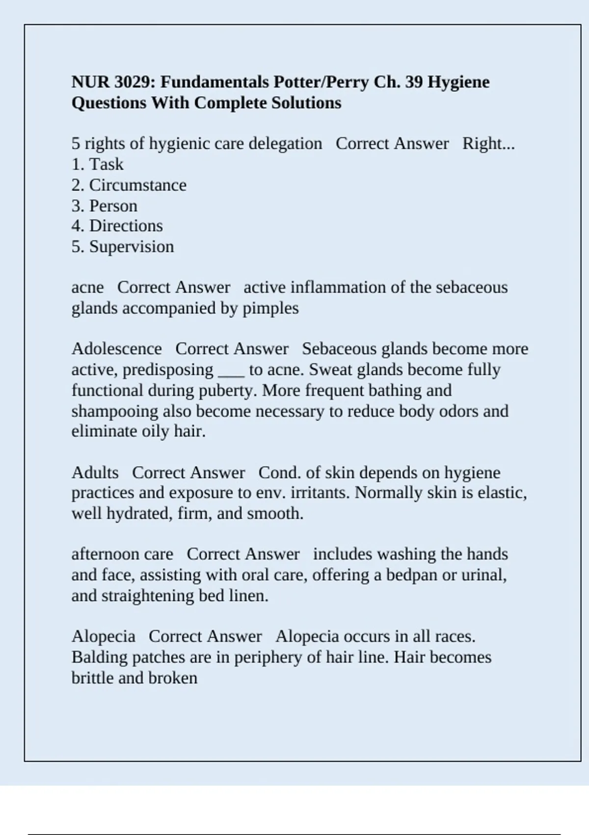 5 rights of hygienic care delegation Correct Answer Right...