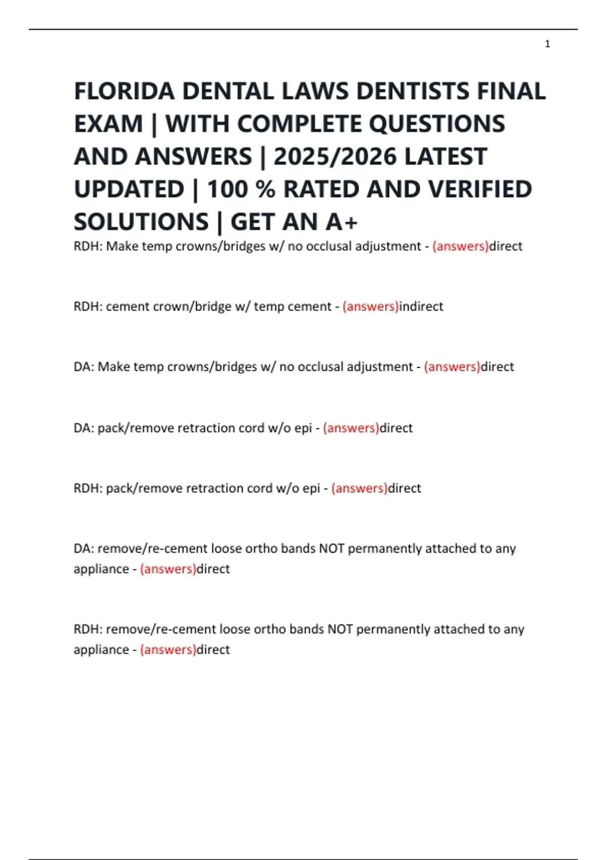 FLORIDA DENTAL LAWS DENTISTS FINAL EXAM | WITH COMPLETE QUESTIONS AND ANSWERS | 2025/2026 LATEST UPDATED | 100 % RATED AND VERIFIED SOLUTIONS | GET AN A+