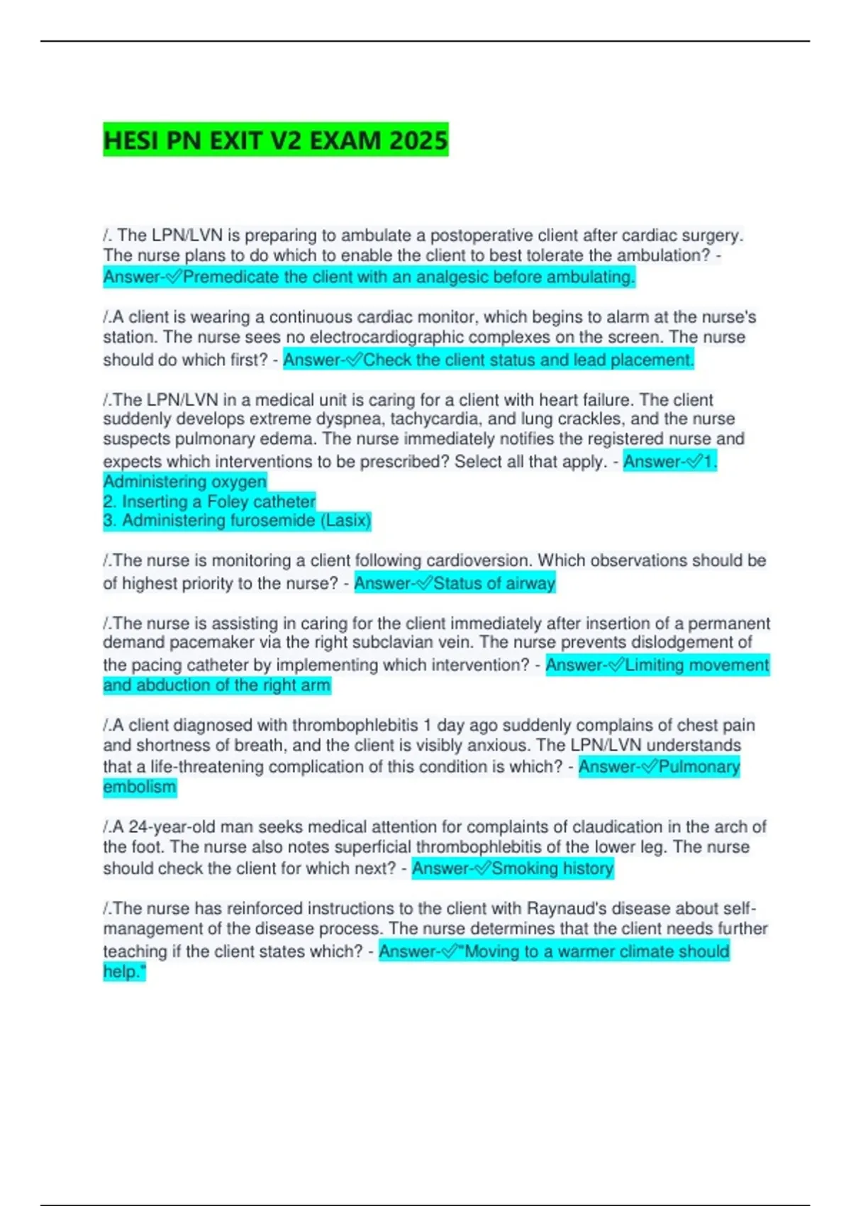 HESI PN EXIT V2 EXAM 2025 /. The LPN/LVN is preparing to ambulate a postoperative client after cardiac surgery. The nurse plans to do which to enable the client to best tolerate the ambulation? - Answer-Premedicate the client with an analgesic before ambulating. /.A client is wearing a continuous cardiac monitor, which begins to alarm at the nurse's station. The nurse sees no electrocardiographic complexes on the screen. The nurse should do which first? - Answer-Check the client status and lead placement. /.The LPN/LVN in a medical unit is caring for a client with heart failure. The client suddenly develops extreme dyspnea, tachycardia, and lung crackles, and the nurse suspects pulmonary edema. The nurse immediately notifies the registered nurse and expects which interventions to be prescribed? Select all that apply. - Answer-1. Administering oxygen 2. Inserting a Foley catheter 3. Administering furosemide (Lasix) /.The nurse is monitoring a client following cardioversion. Which observations should be of highest priority to the nurse? - Answer-Status of airway /.The nurse is assisting in caring for the client immediately after insertion of a permanent demand pacemaker via the right subclavian vein. The nurse prevents dislodgement of the pacing catheter by implementing which intervention? - Answer-Limiting movement and abduction of the right arm /.A client diagnosed with thrombophlebitis 1 day ago suddenly complains of chest pain and shortness of breath, and the client is visibly anxious. The LPN/LVN understands that a life-threatening complication of this condition is which? - Answer-Pulmonary embolism /.A 24-year-old man seeks medical attention for complaints of claudication in the arch of the foot. The nurse also notes superficial thrombophlebitis of the lower leg. The nurse should check the client for which next? - Answer-Smoking history /.The nurse has reinforced instructions to the client with Raynaud's disease about self-management of the disease process. The nurse determines that the client needs further teaching if the client states which? - Answer-"Moving to a warmer climate should help." /.A client with myocardial infarction suddenly becomes tachycardic, shows signs of air hunger, and begins coughing frothy, pink-tinged sputum. The nurse listens to breath sounds, expecting to hear which breath sounds bilaterally? - Answer-Crackles /.The LPN/LVN is collecting data on a client with a diagnosis of right- sided heart failure. The nurse should expect to note which specific characteristic of this condition? - Answer-Dependent edema /.The LPN/LVN is checking the neurovascular status of a client who returned to the surgical nursing unit 4 hours ago after undergoing an aortoiliac bypass graft. The affected leg is warm, and the nurse notes redness and edema. The pedal pulse is palpable and unchanged from admission. The nurse interprets that the neurovascular status is which? - Answer-Normal, caused by increased blood flow through the leg /.A client with a diagnosis of rapid rate atrial fibrillation asks the nurse why the health care provider is going to perform carotid massage. The LPN/LVN responds that this procedure may stimulate which? - Answer-Vagus nerve to slow the heart rate /.A client is admitted to the hospital with possible rheumatic endocarditis. The LPN/LVN should check for a history of which type of infection? - Answer-Staphylococcal infection /.client has an Unna boot applied for treatment of a venous stasis leg ulcer. The LPN/LVN notes that the client's toes are mottled, and cool and the client verbalizes some numbness and tingling of the foot. Which interpretation should the nurse make of these findings? - Answer-The boot has been applied too tightly /.A client with angina complains that the anginal pain is prolonged and severe and occurs at the same time each day, most often in the morning. On further data collection, the nurse notes that the pain occurs in the absence of precipitating factors. How should the LPN/LVN best describe this type of anginal pain? - Answer-Variant angina /.The LPN/LVN is monitoring a client with an abdominal aortic aneurysm (AAA). Which finding is probably unrelated to the AAA? - Answer-Hyperactive bowel sounds in the area /.An emergency department client who complains of slightly improved but unrelieved chest pain for 2 days is reluctant to take a nitroglycerin sublingual tablet offered by the nurse. The client states, "I don't need that—my dad takes that for his heart. There's nothing wrong with my heart." Which description best describes the client's response? - Answer-Denial /.A client is scheduled for a cardiac catheterization using a radiopaque dye. The LPN/LVN checks which most critical item before the procedure? - Answer-Prior reaction to contrast media /.A client is scheduled for a dipyridamole thallium scan. The LPN/ LVN should check to make sure that the client has not consumed which substance before the procedure? - Answer-Caffeine /.An ambulatory clinic nurse is interviewing a client who is complaining of flulike symptoms. The client suddenly develops chest pain. Which question best assists the nurse to discriminate pain caused by a non cardiac problem? - Answer-"Does the pain get worse when you breathe in?" /.A client with myocardial infarction (MI) has been transferred from the coronary care unit (CCU) to the general medical unit with cardiac monitoring via telemetry. The nurse assisting in caring for the client expects to note which type of activity prescribed? - Answer-Bathroom privileges and self-care activities /.The LPN/LVN is preparing to care for a client who will be arriving from the recovery room after an above-the-knee amputation. The nurse ensures that which priority item is available for emergency use? - Answer-Surgical tourniquet /.A client is diagnosed with thrombophlebitis. The nurse should tell the client that which prescription is indicated? - Answer-Bed rest, with elevation of the affected extremity /.A client