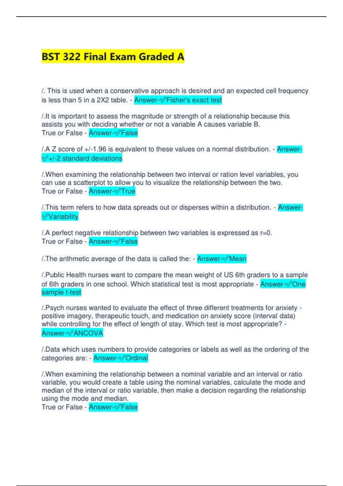 BST 322 Final Exam Graded A /. This is used when a conservative approach is desired and an expected cell frequency is less than 5 in a 2X2 table. - Answer-Fisher's exact test /.It is important to assess the magnitude or strength of a relationship because this assists you with deciding whether or not a variable A causes variable B. True or False - Answer-False /.A Z score of +/-1.96 is equivalent to these values on a normal distribution. - Answer-+/-2 standard deviations /.When examining the relationship between two interval or ration level variables, you can use a scatterplot to allow you to visualize the relationship between the two. True or False - Answer-True /.This term refers to how data spreads out or disperses within a distribution. - Answer-Variability /.A perfect negative relationship between two variables is expressed as r=0. True or False - Answer-False /.The arithmetic average of the data is called the: - Answer-Mean /.Public Health nurses want to compare the mean weight of US 6th graders to a sample of 6th graders in one school. Which statistical test is most appropriate - Answer-One sample t-test /.Psych nurses wanted to evaluate the effect of three different treatments for anxiety - positive imagery, therapeutic touch, and medication on anxiety score (interval data) while controlling for the effect of length of stay. Which test is most appropriate? - Answer-ANCOVA /.Data which uses numbers to provide categories or labels as well as the ordering of the categories are: - Answer-Ordinal /.When examining the relationship between a nominal variable and an interval or ratio variable, you would create a table using the nominal variables, calculate the mode and median of the interval or ratio variable, then make a decision regarding the relationship using the mode and median. True or False - Answer-False