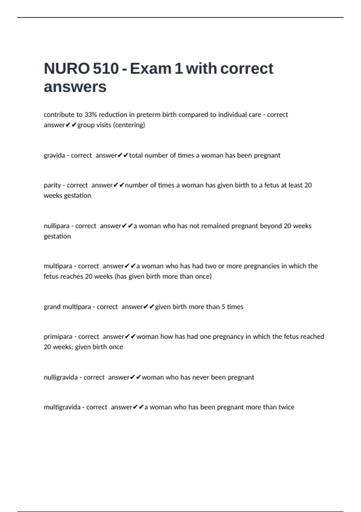 nullipara - correct answer✔✔a woman who has not remained pregnant beyond 20 weeks