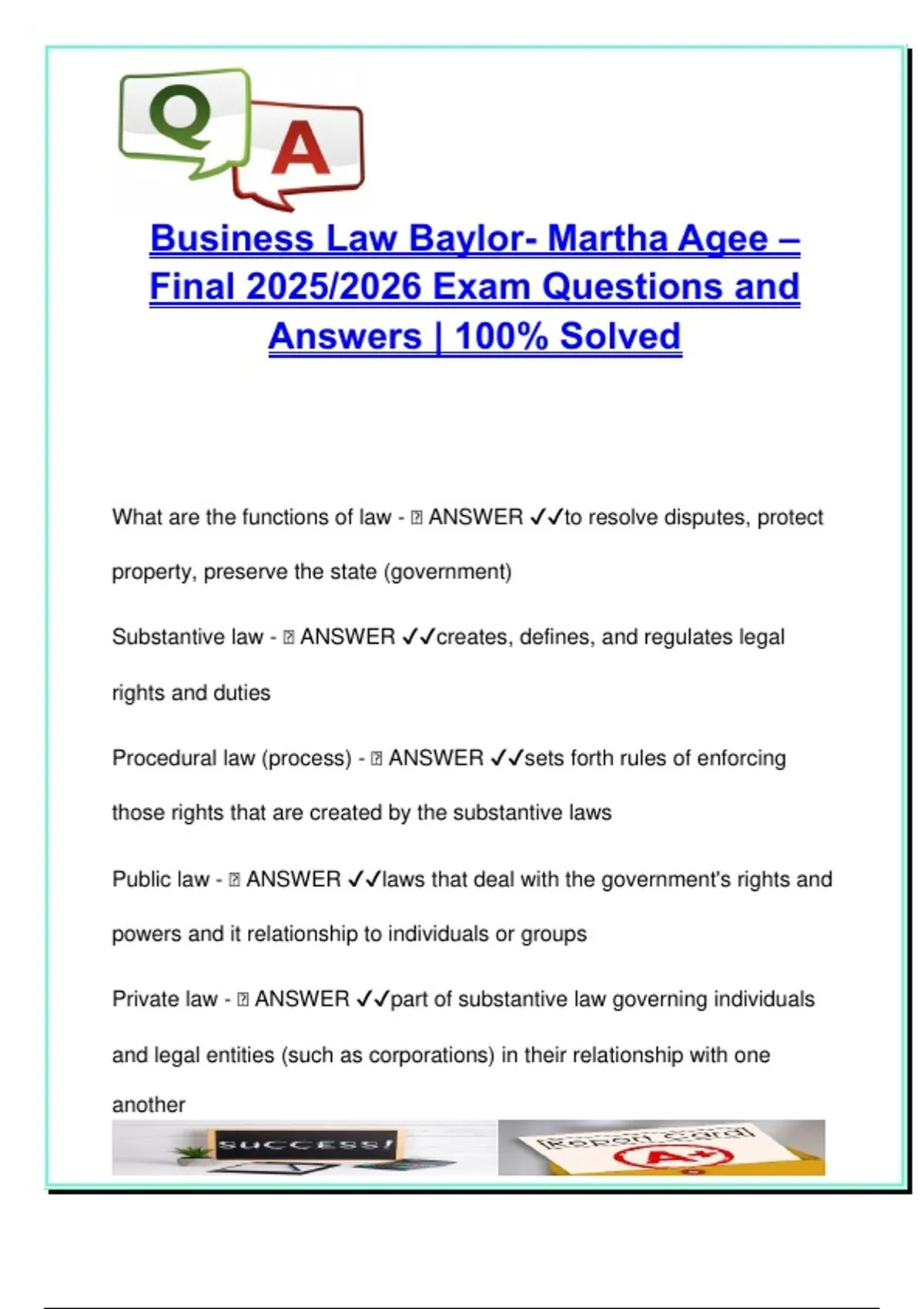 This document contains comprehensive final exam questions and fully solved answers from the Business Law course at Baylor University for the academic year 2025/2026. Covering over 100 questions, it offers an in-depth review of foundational legal concepts relevant to business, making it a valuable resource for both exam preparation and long-term understanding of legal principles applied in commercial contexts. Key topics include the functions and classifications of law (such as public vs. private, criminal vs. civil, substantive vs. procedural), the U.S. court system, jurisdiction rules (subject matter, personal, in rem, and quasi in rem), and legal procedures including pleadings, discovery, pre-trial motions, and alternative dispute resolution methods like arbitration and mediation. It also provides detailed explanations of: Constitutional law principles like federalism, separation of powers, commerce clause, and due process Criminal law (actus reus, mens rea, white-collar crimes) Tort law, including intentional torts, negligence, strict liability, and product liability Contract law, from formation and enforceability (offer, acceptance, consideration, capacity, legality) to defenses (fraud, duress, misrepresentation), types of contracts (unilateral, bilateral, voidable, quasi-contract), and performance and remedies UCC applications and contract rules specific to the sale of goods This exam preparation guide is ideal for: Business and Finance students Pre-law undergraduates MBA candidates taking business law Entrepreneurship and management majors Anyone preparing for exams involving commercial and constitutional law Every question is paired with a clear and verified answer, making this document not just a review sheet, but a complete legal study aid for mastering business law at the university level. Keywords: functions of law, substantive law, procedural law, jurisdiction, federal vs state courts, tort law, criminal law, contract elements, offer and acceptance, UCC, consideration, fraud, negligence, strict liability, arbitration, due process, equal protection, commerce clause, business law exam, Baylor University