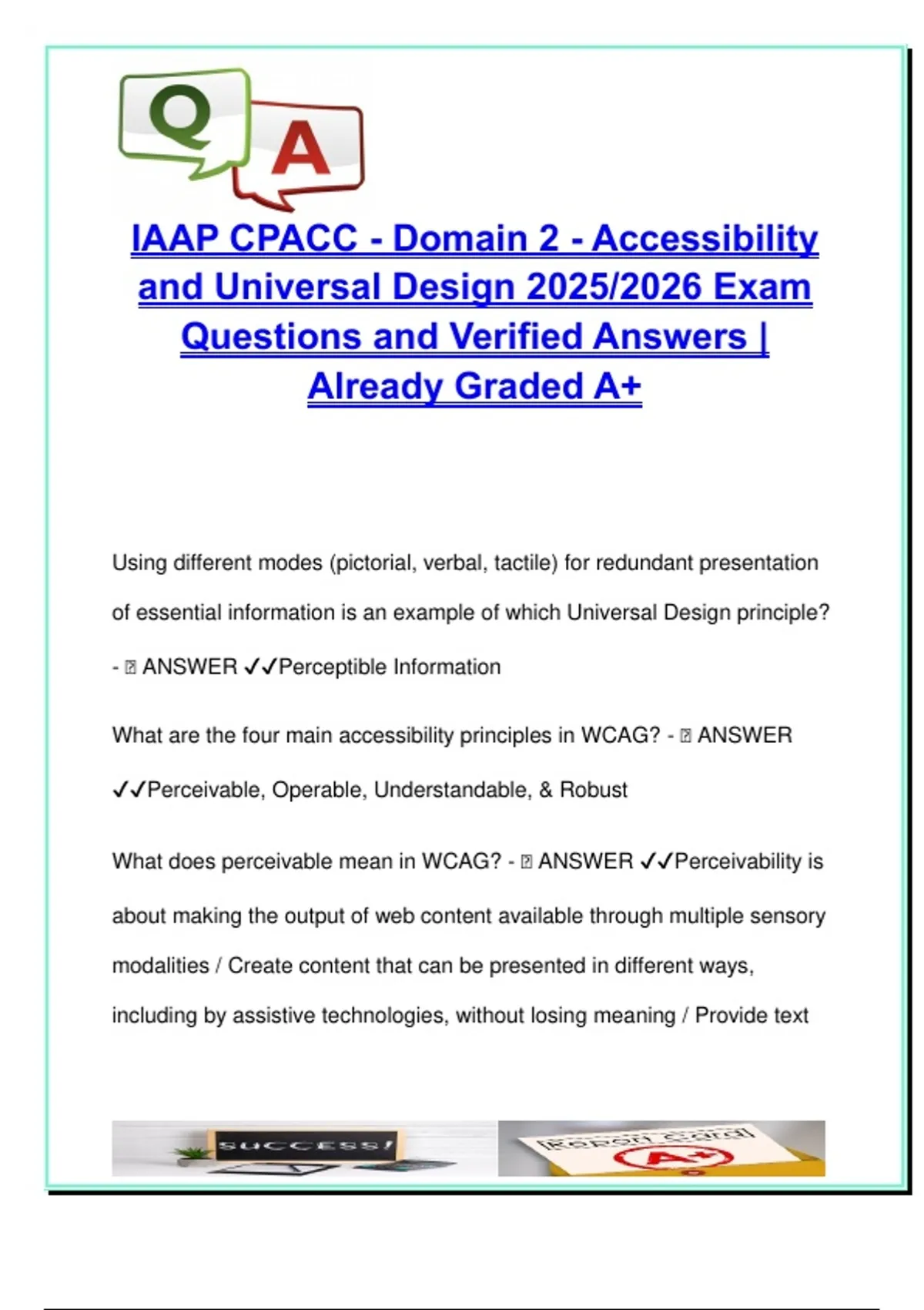 This document offers 150+ expertly solved and A+ graded questions aligned with the IAAP CPACC (Certified Professional in Accessibility Core Competencies) certification for the 2025/2026 exam year. Sourced from the Ninjanerd Series, it provides highly targeted exam preparation across all key CPACC knowledge domains. Each question is clearly structured with precise answers, enabling learners to deeply understand principles of accessibility, inclusive design, universal learning, and usability. Key focus areas covered include: WCAG Principles: Perceivable, Operable, Understandable, Robust (POUR), with real-world examples ARIA Roles & Assistive Technologies: screen readers, Braille, voice recognition, and touch-free navigation Universal Design (UD): All 7 core principles with practical case applications (e.g., touchscreens, public restrooms, workplace layouts) Universal Design for Learning (UDL): Multiple means of engagement, representation, and expression; applied in classroom and e-learning Built Environment & ICT Accessibility: inclusive design in public infrastructure, software tools, mobile apps, and digital content Disability Models: Social, Functional, Biopsychosocial—aligned with accessible design frameworks Usability vs Accessibility: Key differences and overlaps, emotional experience in UX, success criteria This resource is especially useful for: UX/UI designers, front-end developers, accessibility engineers, and web architects Instructional designers, education technologists, and inclusive education professionals Disability services teams, compliance officers, and public policy implementers University students in Human-Computer Interaction, Accessibility Studies, Web Development, Special Education, and Digital Communication Anyone preparing for the IAAP CPACC certification, AHG training, or implementing digital inclusion in their workplace Designed to serve both as a comprehensive exam prep tool and a real-world accessibility reference, this guide empowers users with the knowledge needed to pass the CPACC exam and lead accessibility efforts in professional environments. Keywords: CPACC exam questions, IAAP certification guide, WCAG principles, universal design, ARIA accessibility, UDL framework, UX and usability, inclusive technology, digital accessibility, assistive technology, accessibility laws, user agent, authoring tools, web accessibility, screen reader compatibility, tactile design, inclusive education, accessible ICT, usability standards, disability inclusion