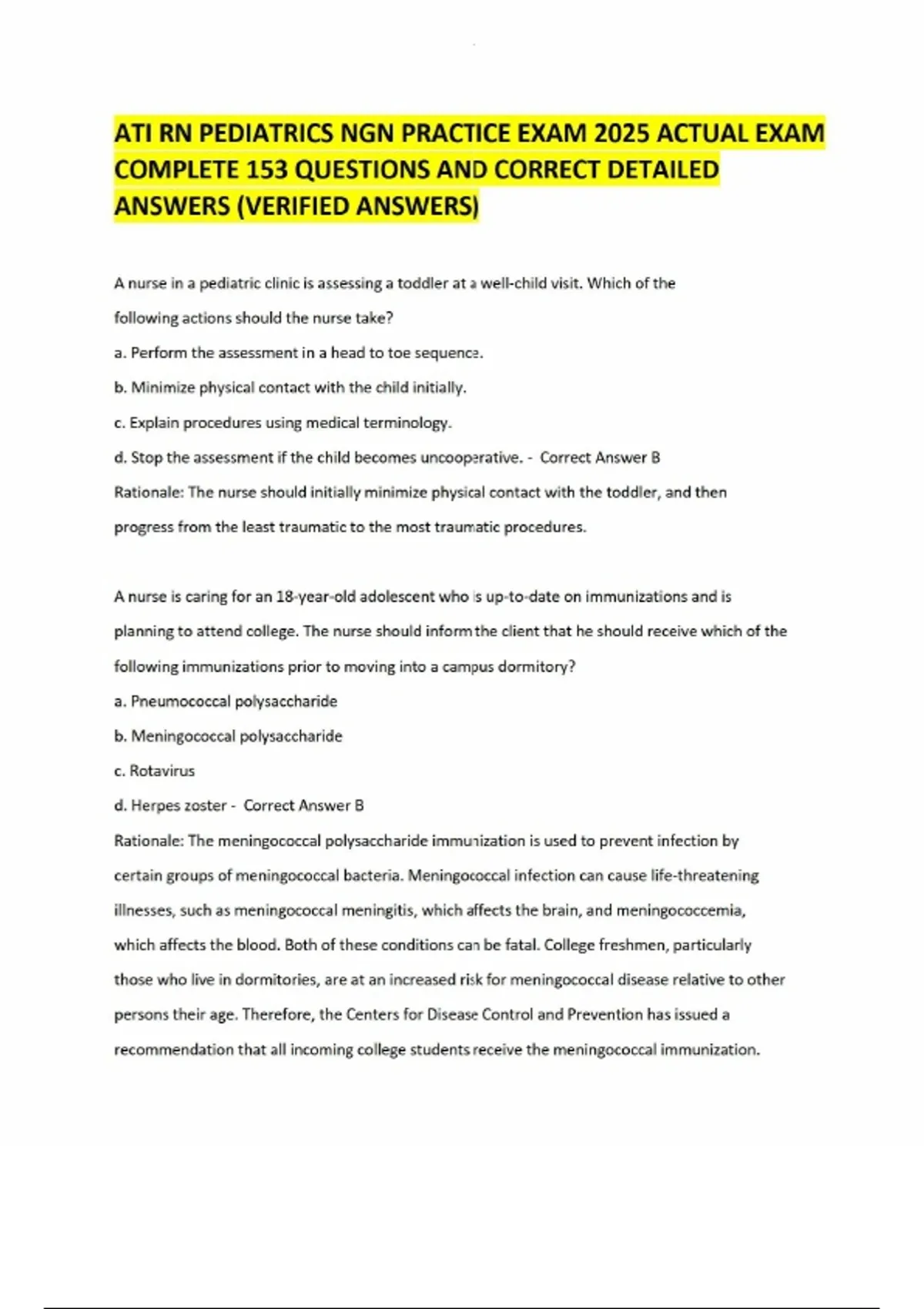 ATI RN PEDIATRICS NGN PRACTICE EXAM 2025 ACTUAL EXAM COMPLETE 153 QUESTIONS AND CORRECT DETAILED ANSWERS (VERIFIED ANSWERS) A nurse in a pediatric clinic is assessing a toddler at a well-child visit. Which of the following actions should the nurse take? a. Perform the assessment in a head to toe sequence. b. Minimize physical contact with the child initially. c. Explain procedures using medical terminology. d. Stop the assessment if the child becomes uncooperative. - Correct Answer B Rationale: The nurse should initially minimize physical contact with the toddler, and then progress from the least traumatic to the most traumatic procedures. A nurse is caring for an 18-year-old adolescent who is up-to-date on immunizations and is planning to attend college. The nurse should inform the client that he should receive which of the following immunizations prior to moving into a campus dormitory? a. Pneumococcal polysaccharide b. Meningococcal polysaccharide c. Rotavirus d. Herpes zoster - Correct Answer B Rationale: The meningococcal polysaccharide immunization is used to prevent infection by certain groups of meningococcal bacteria. Meningococcal infection can cause life-threatening illnesses, such as meningococcal meningitis, which affects the brain, and meningococcemia, which affects the blood. Both of these conditions can be fatal. College freshmen, particularly those who live in dormitories, are at an increased risk for meningococcal disease relative to other persons their age. Therefore, the Centers for Disease Control and Prevention has issued a recommendation that all incoming college students receive the meningococcal immunization.