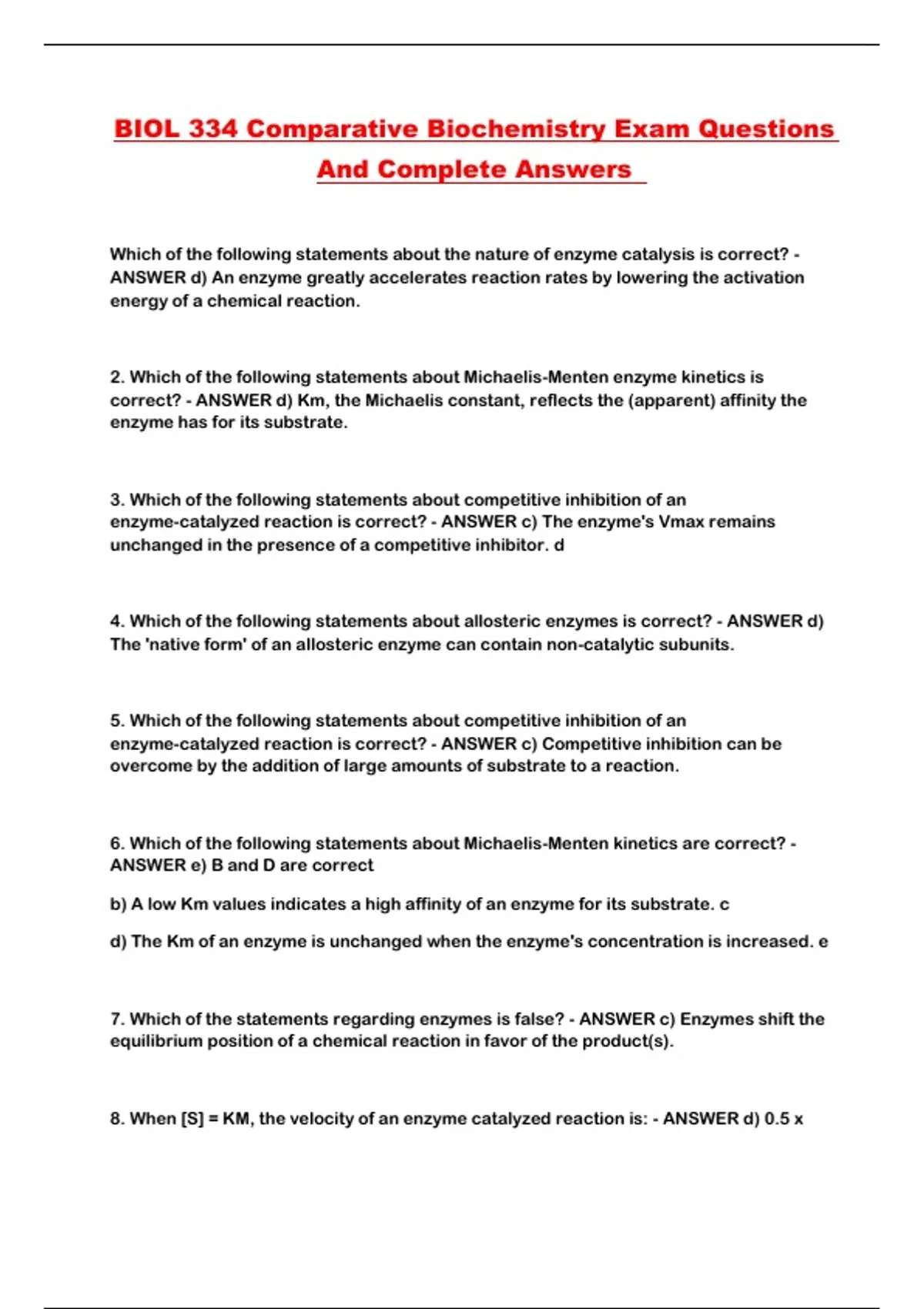 BIOL 334 Comparative Biochemistry Exam Questions And Complete Answers