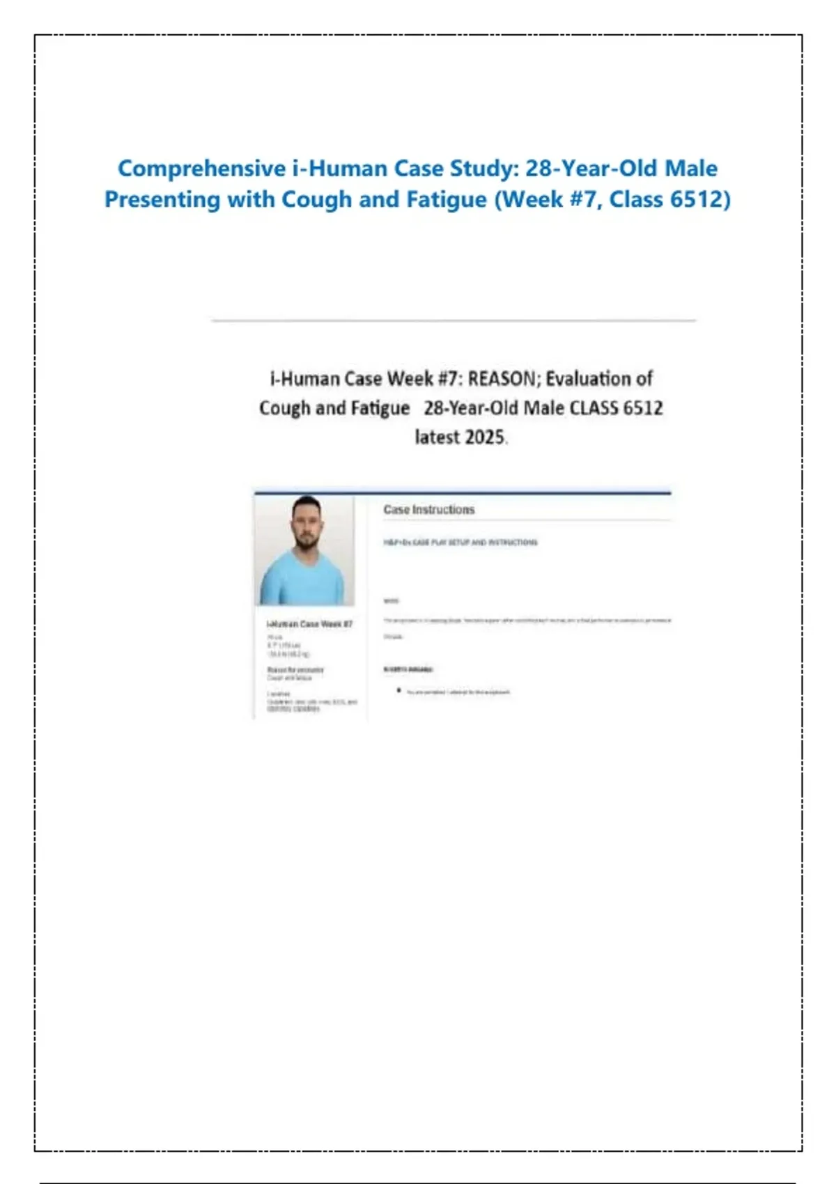 This comprehensive i-Human case study focuses on a 28-year-old male presenting with cough and fatigue, emphasizing advanced clinical reasoning, diagnostic decision-making, and patient-centered care. Designed for graduate-level nursing and healthcare students, this Week 7 case (Class 6512) integrates subjective and objective data, differential diagnosis formulation, and evidence-based management planning. The activity guides learners through the complete clinical encounter, including history taking, physical assessment, diagnostic interpretation, and creation of a safe, effective plan of care. Students apply knowledge of pathophysiology, pharmacology, and clinical practice guidelines to identify potential causes such as respiratory infection, pneumonia, asthma, or other systemic conditions contributing to the patient’s symptoms.