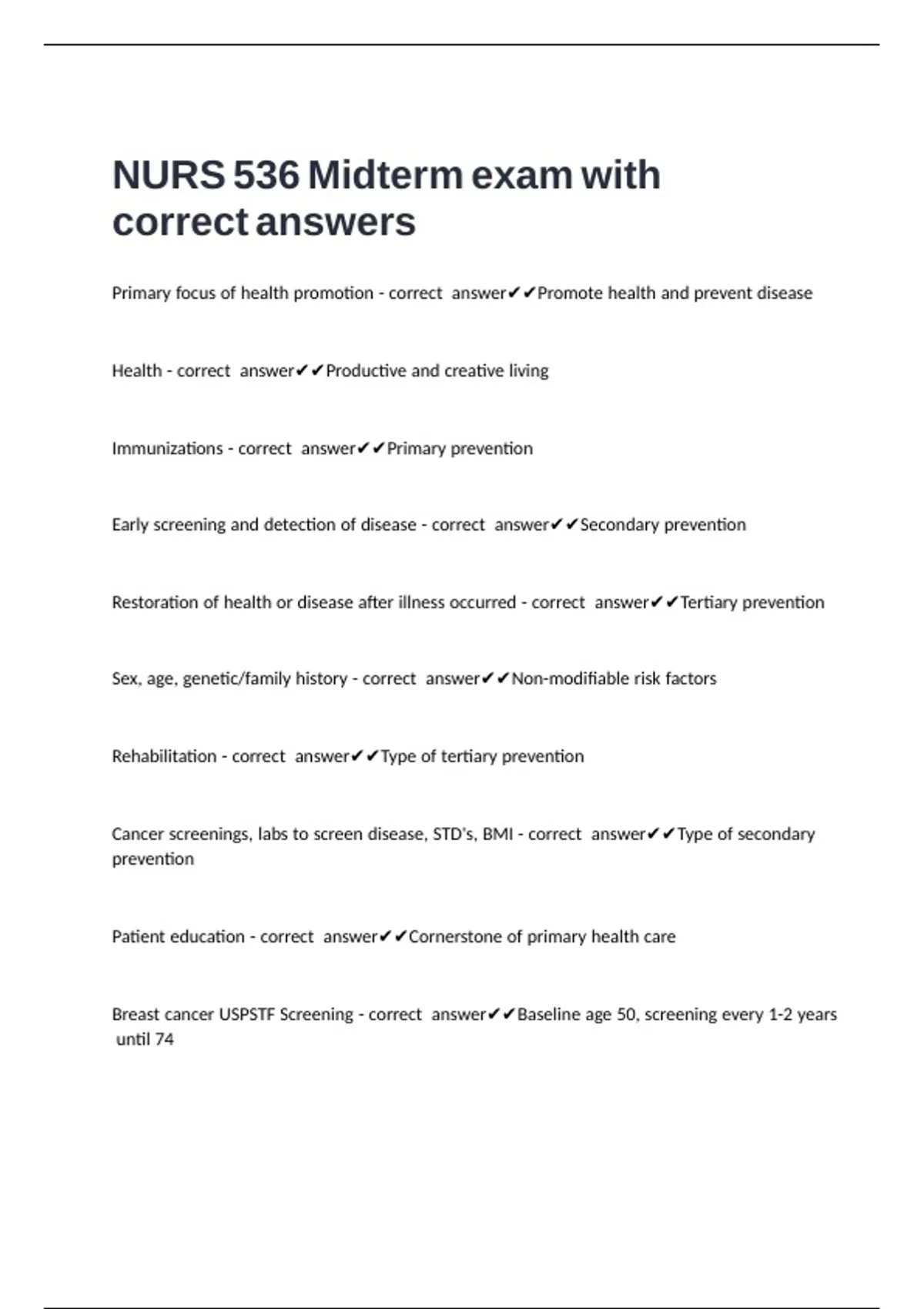 Early screening and detection of disease - correct answer✔✔Secondary prevention