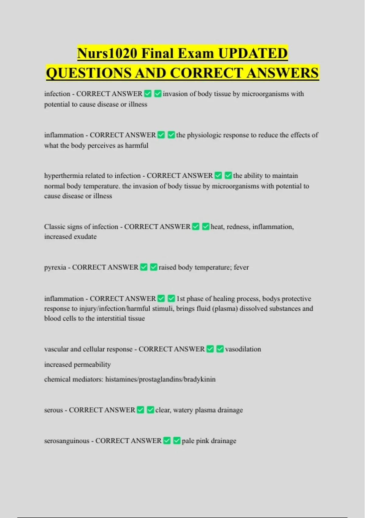 Nurs1020 Final Exam UPDATED QUESTIONS AND CORRECT ANSWERS infection - CORRECT ANSWER potential to cause disease or illness inflammation - CORRECT ANSWER what the body perceives as harmful invasion of body tissue by microorganisms with the physiologic response to reduce the effects of hyperthermia related to infection - CORRECT ANSWER the ability to maintain normal body temperature. the invasion of body tissue by microorganisms with potential to cause disease or illness Classic signs of infection - CORRECT ANSWER increased exudate pyrexia - CORRECT ANSWER heat, redness, inflammation, raised body temperature; fever inflammation - CORRECT ANSWER 1st phase of healing process, bodys protective response to injury/infection/harmful stimuli, brings fluid (plasma) dissolved substances and blood cells to the interstitial tissue