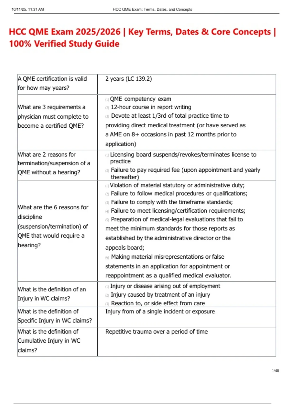 HCC QME Exam 2025/2026 | Key Terms, Dates & Core Concepts | 100% Verified Study Guide