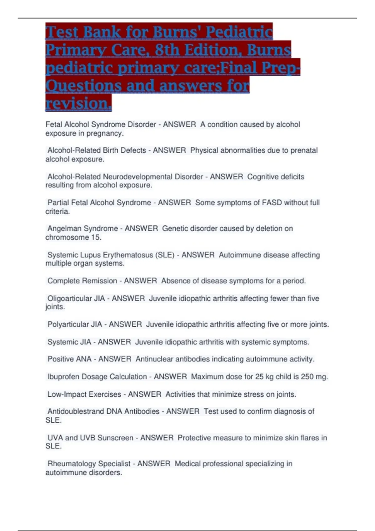Test Bank for Burns' Pediatric Primary Care, 8th Edition, Burns pediatric primary care;Final Prep-Questions and answers for revision.