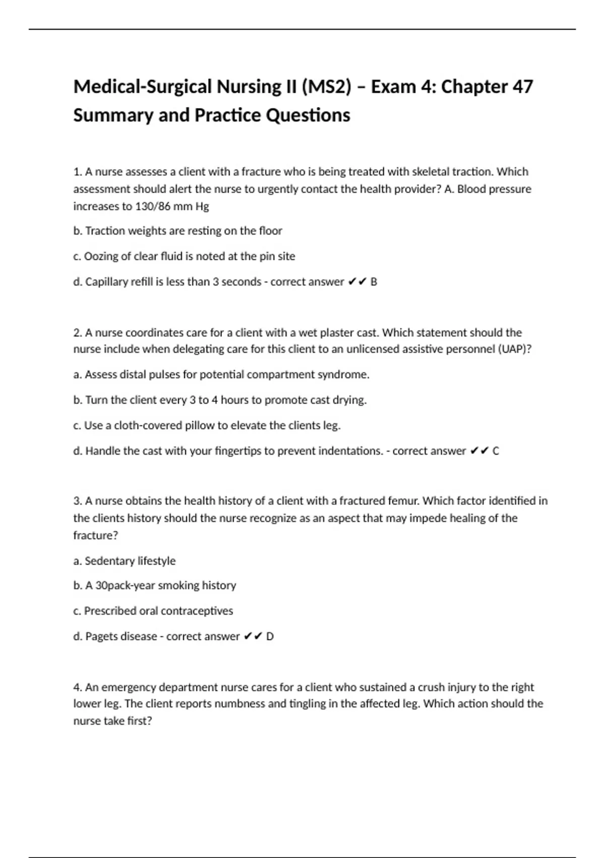 1. A nurse assesses a client with a fracture who is being treated with skeletal traction. Which