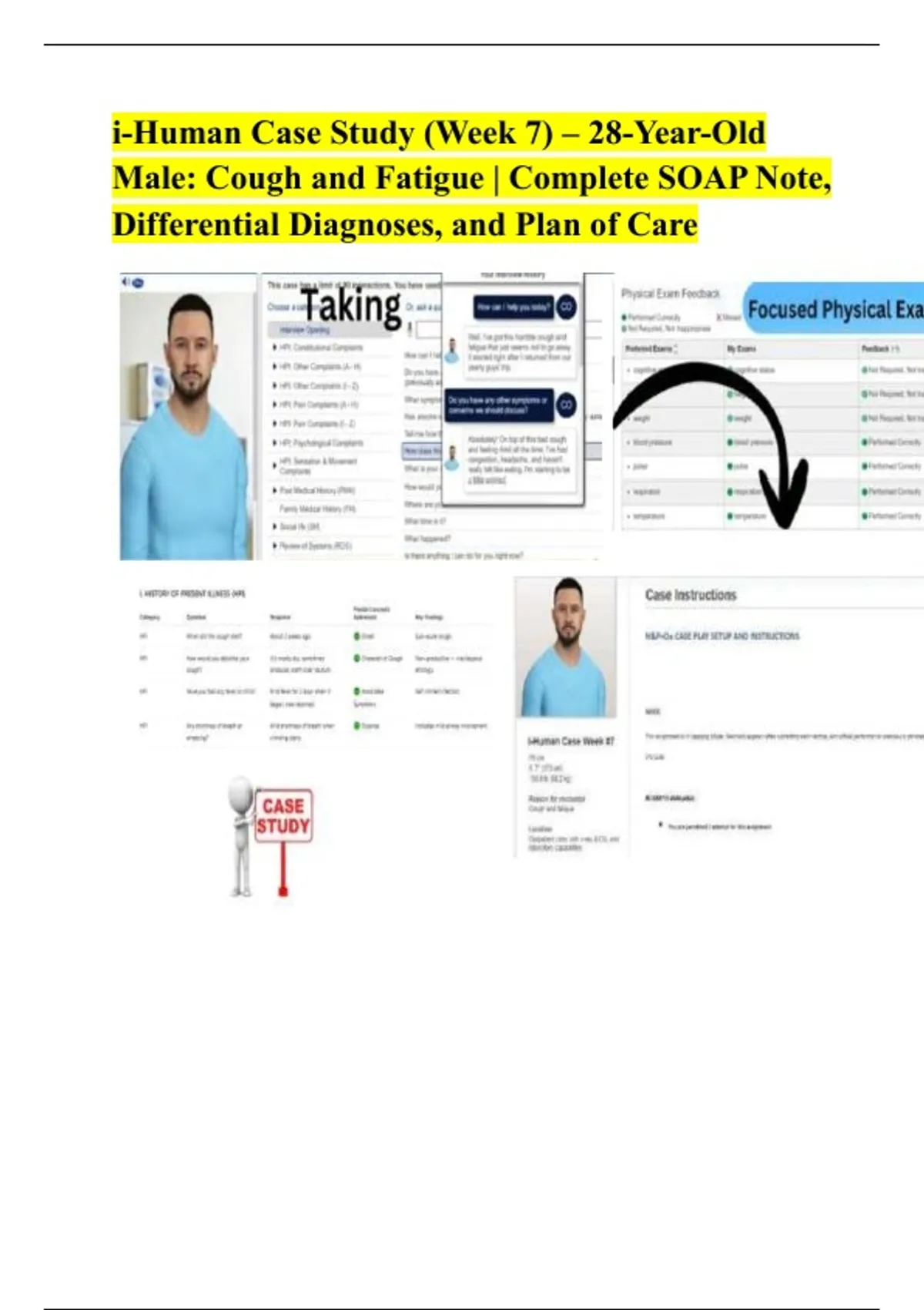 Comprehensive i-Human Case Study – Week 7 for NURS 6512: Advanced Health Assessment at Walden University (2025). This case focuses on a 28-year-old male presenting with cough and fatigue, providing a complete, evidence-based clinical write-up that helps students master advanced diagnostic reasoning. This resource includes: Detailed Subjective and Objective Findings – complete patient interview and physical exam data. Differential Diagnoses – fully explained with pathophysiologic rationale and supporting literature. Final Diagnosis & Clinical Justification – supported by current clinical practice guidelines. SOAP Note Template – formatted for nursing documentation and ready for submission. Plan of Care – includes pharmacologic treatment, patient education, and follow-up recommendations. Perfect for students completing Week 7 i-Human assignments or reviewing respiratory and fatigue-related clinical cases. Updated for 2025 with clear, concise reasoning and formatting consistent with Walden University grading rubrics.