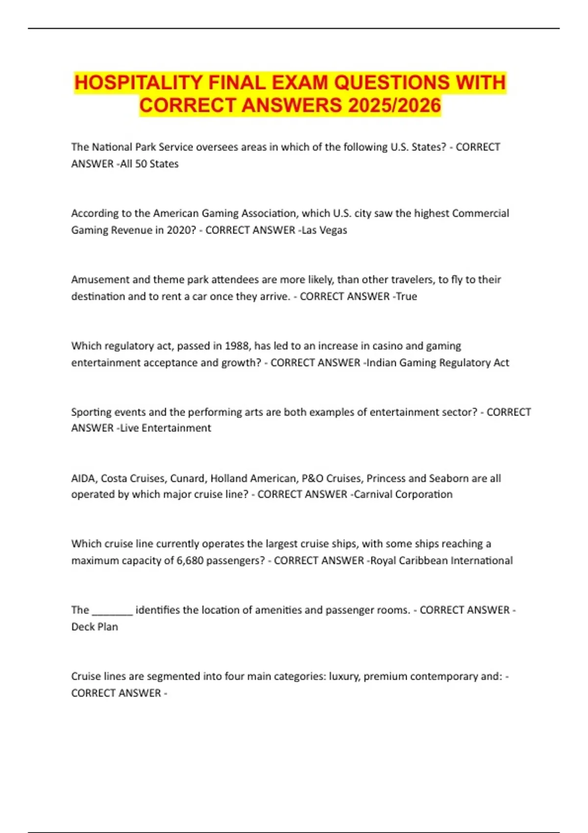 HOSPITALITY FINAL EXAM QUESTIONS WITH CORRECT ANSWERS 2025/2026