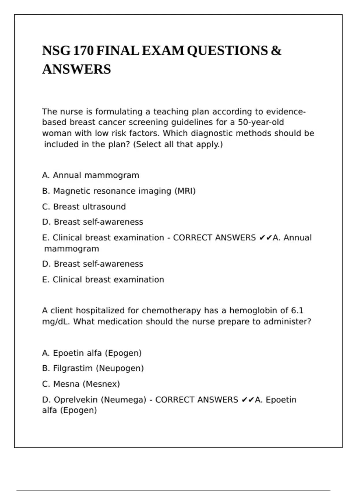 NSG 170 FINAL EXAM QUESTIONS & ANSWERS