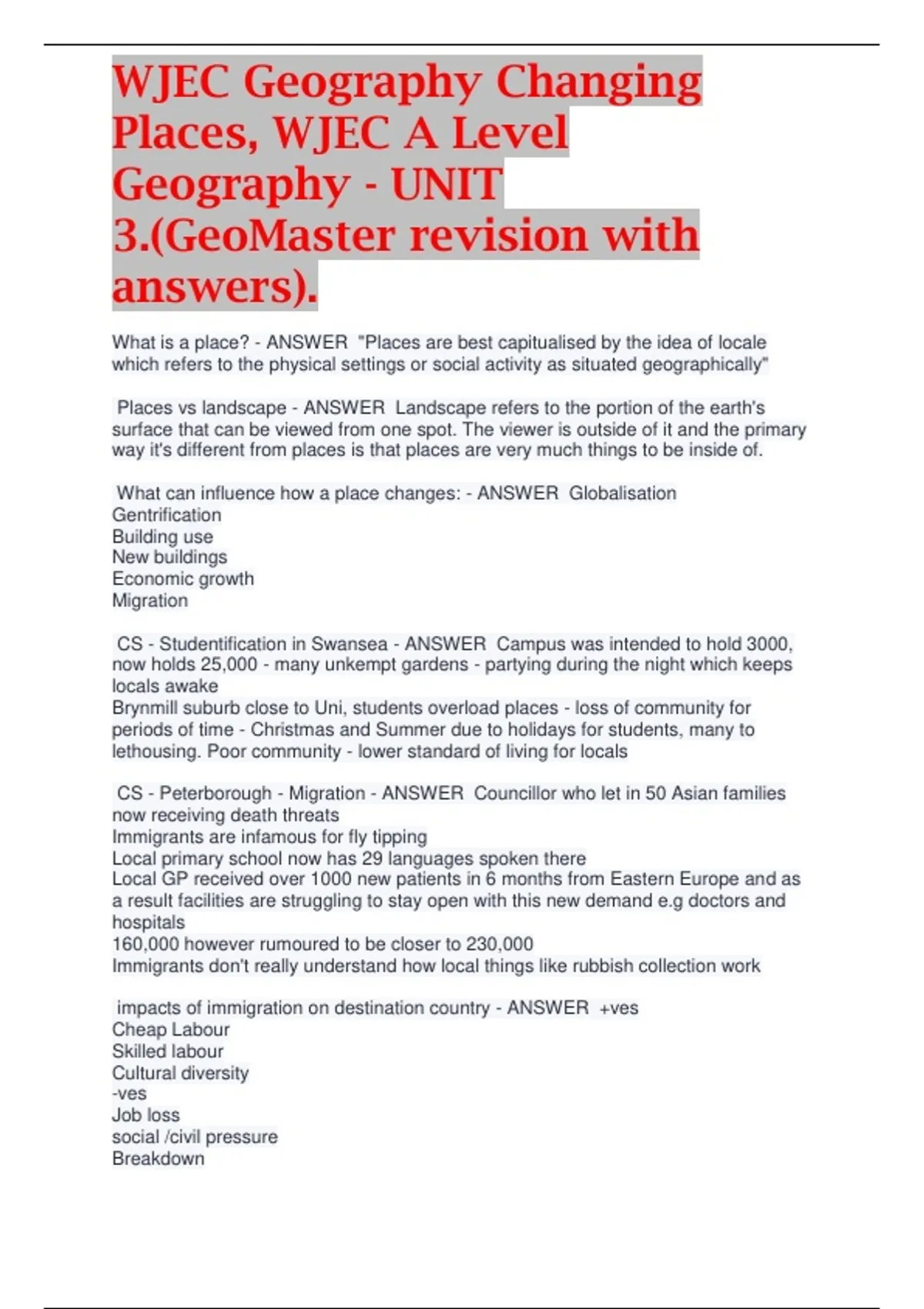 WJEC Geography Changing Places, WJEC A Level Geography - UNIT 3.(GeoMaster revision with answers).