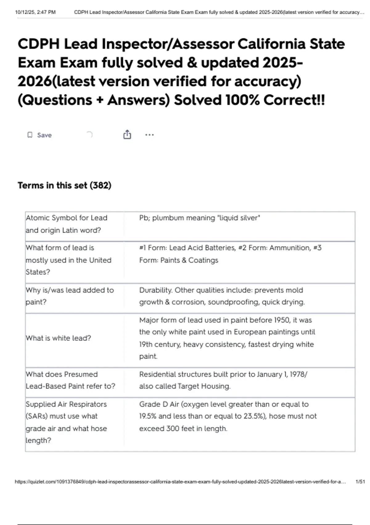https://quizlet.com/1091376849/cdph-lead-inspectorassessor-california-state-exam-exam-fully-solved-updated-2025-2026latest-version-verified-for-a… 1/51