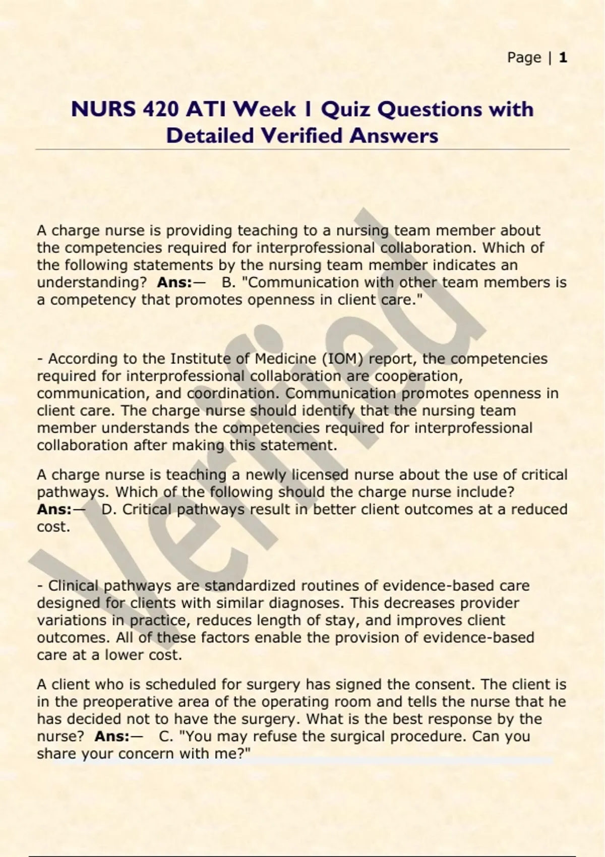 NURS 420 ATI Week 1 Quiz Questions with Detailed Verified Answers