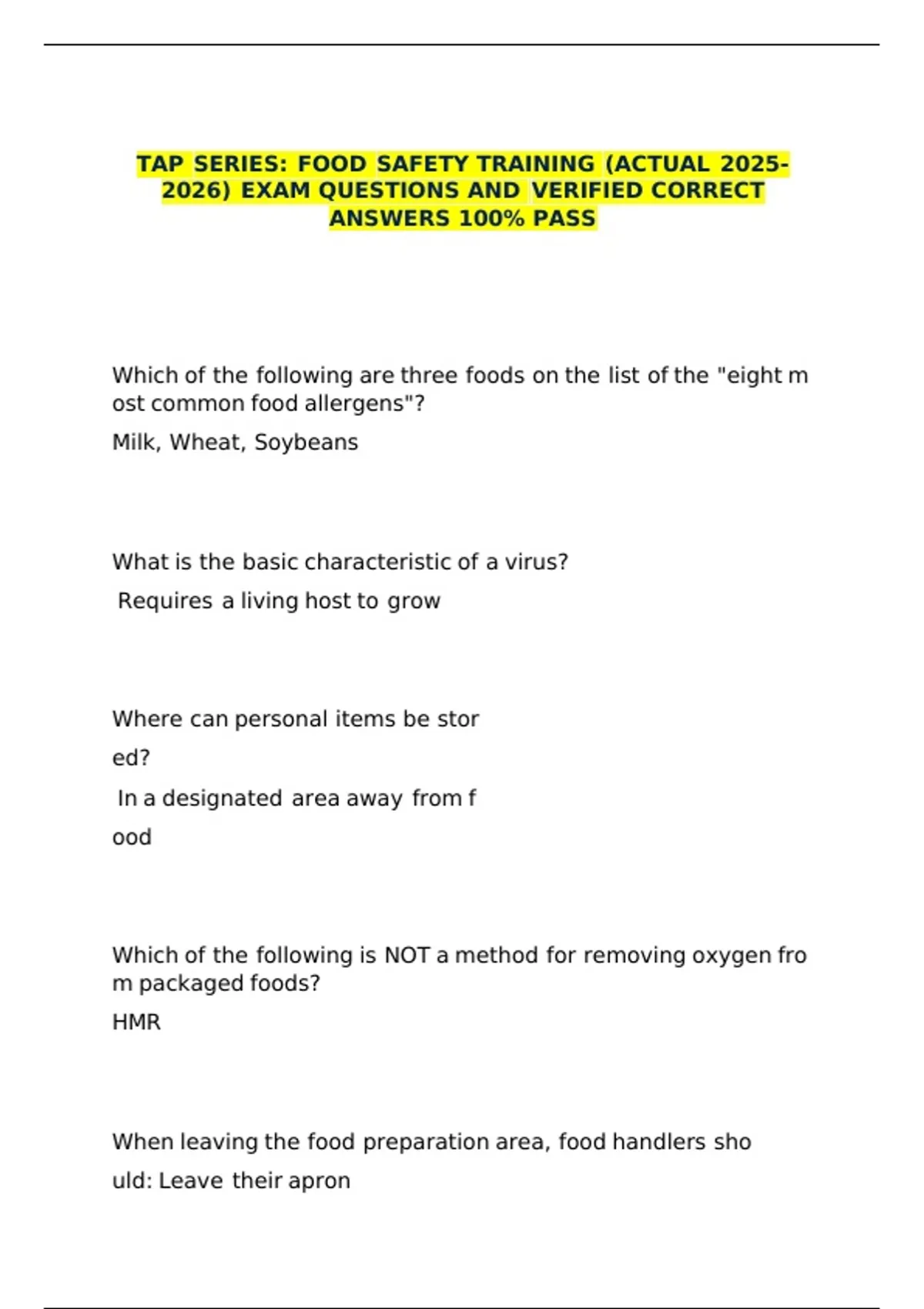 This comprehensive document contains the latest and verified 2025–2026 TAP Series Food Safety Training exam questions and correct answers. It covers all essential food safety concepts including foodborne illness risk factors, contamination types, HACCP principles, FATTOM, safe food handling, cleaning and sanitizing, temperature control, and personal hygiene. Designed to ensure full exam readiness, this material reflects the current TAP Series curriculum and guarantees success for food safety manager certification.