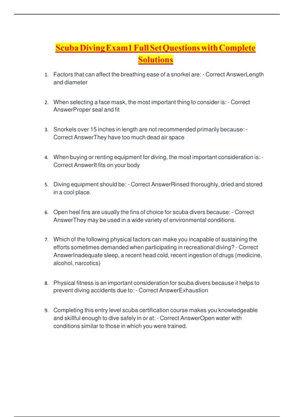 Scuba Diving Exam1 Full Set Questions with Complete