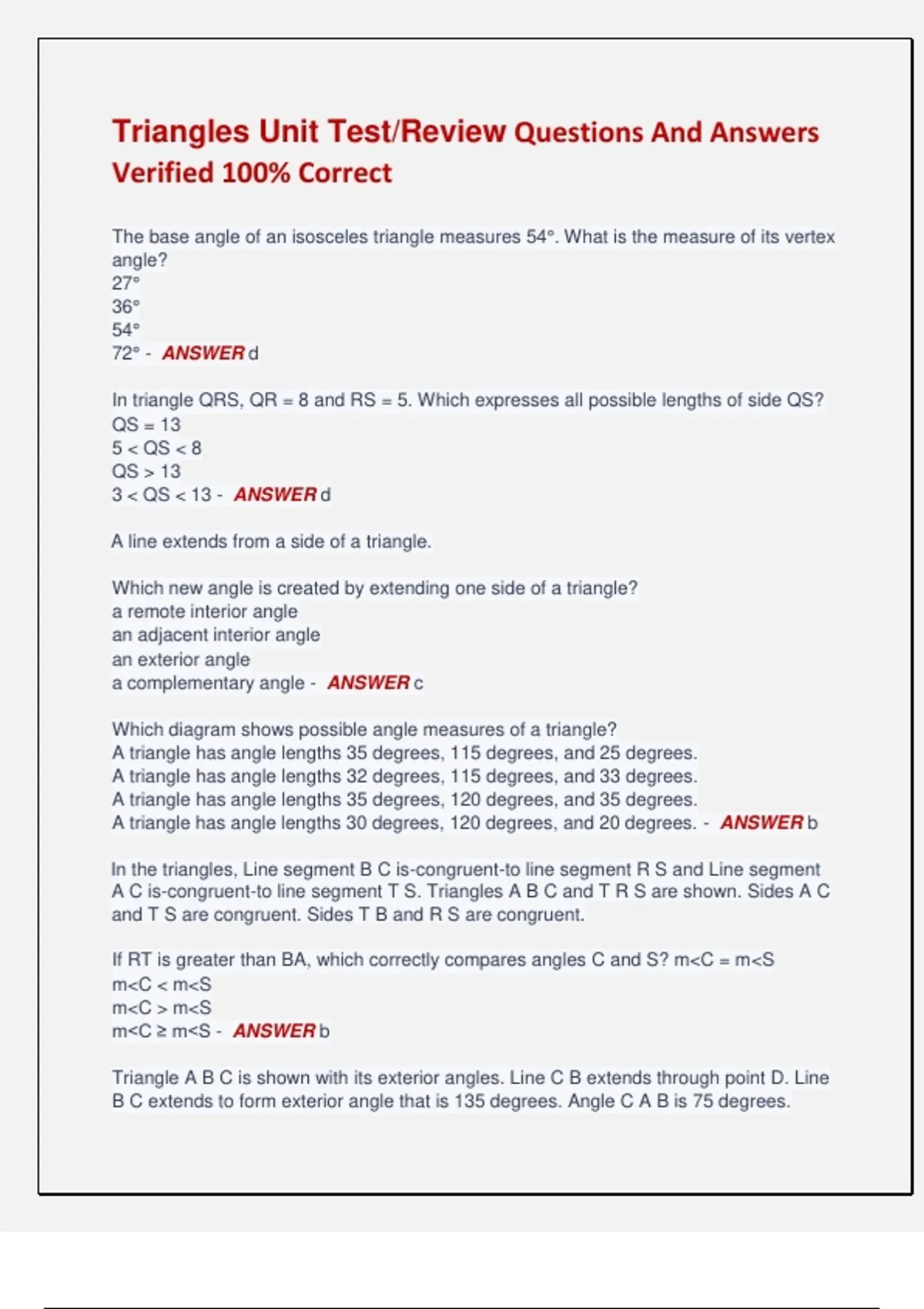 A triangle has angle lengths 30 degrees, 120 degrees, and 20 degrees. - ANSWER b