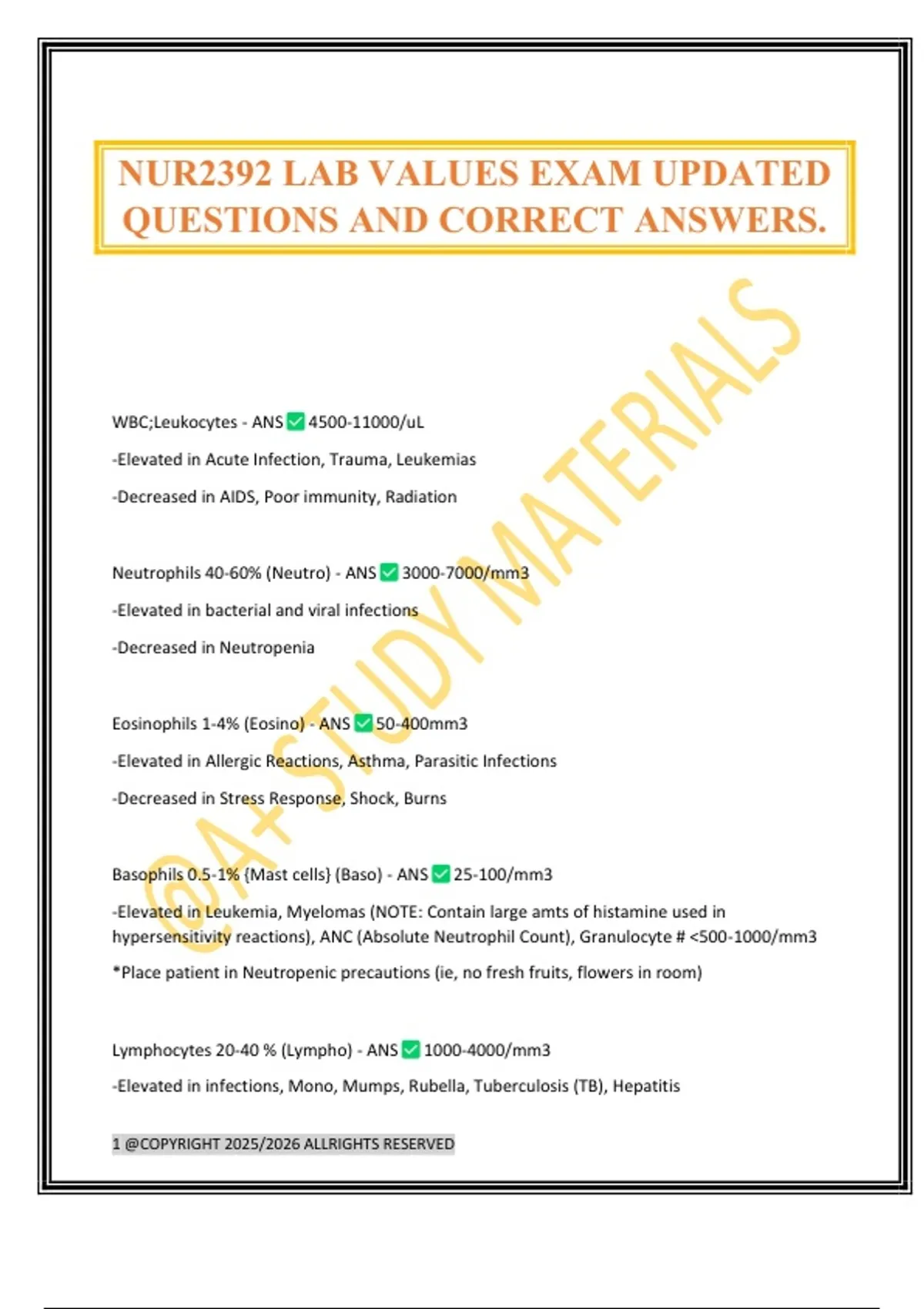 NUR2392 LAB VALUES EXAM UPDATED