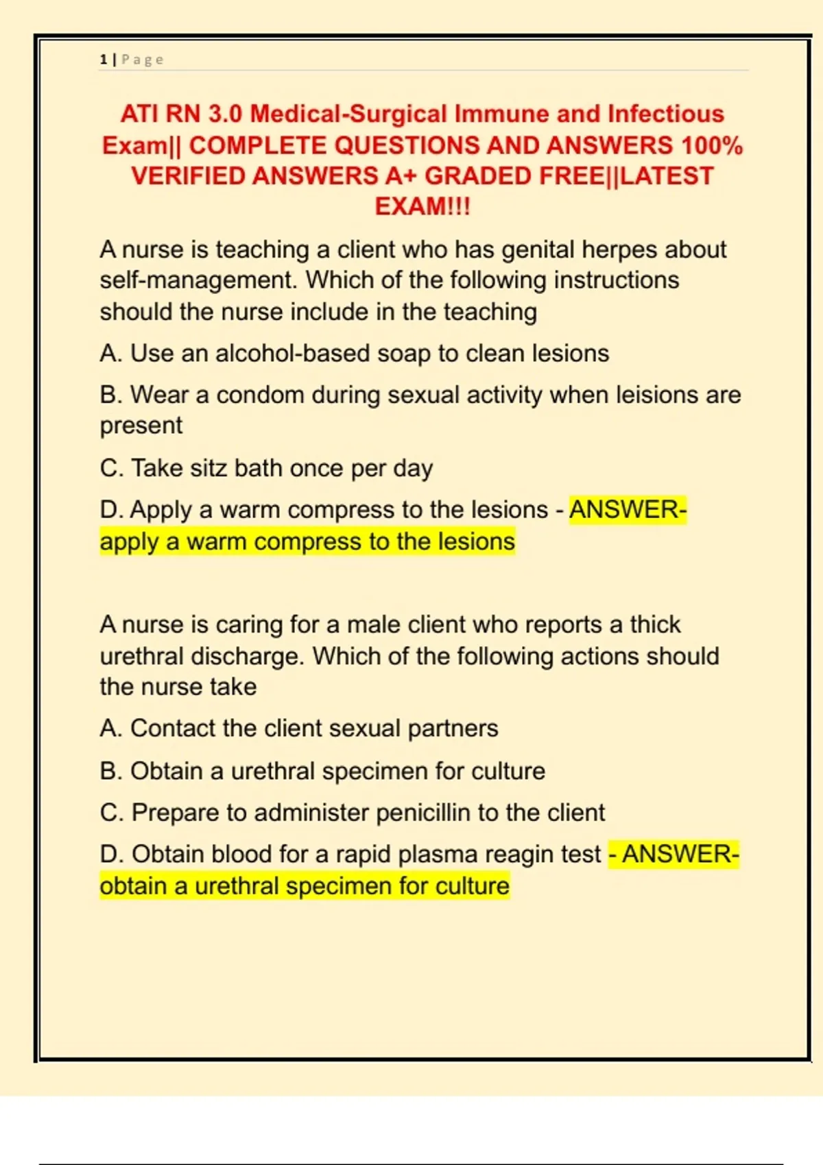 ATI RN 3.0 Medical-Surgical Immune and Infectious Exam|| COMPLETE QUESTIONS AND ANSWERS 100% VERIFIED ANSWERS A+ GRADED FREE||LATEST EXAM!!!