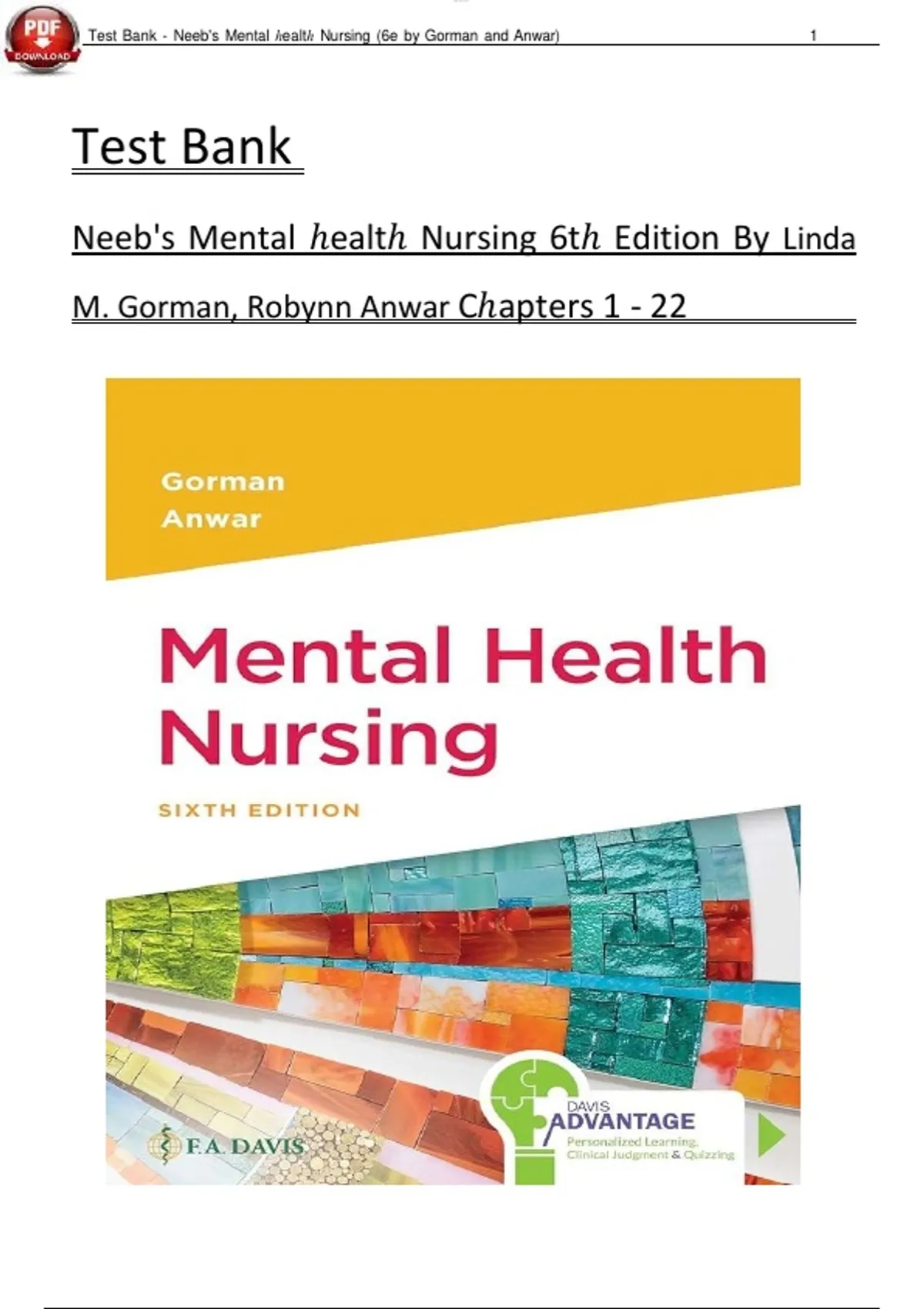 Test Bank - Neeb's Mental ℎealtℎ Nursing (6e by Gorman and Anwar) 1
