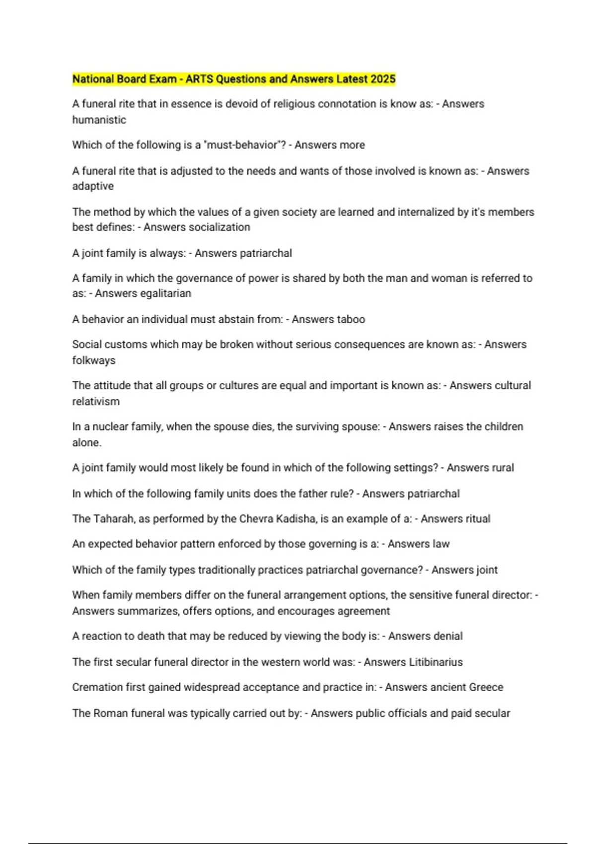 National Board Exam - ARTS Questions and Answers Latest 2025 A funeral rite that in essence is devoid of religious connotation is know as: - Answers humanistic Which of the following is a "must-behavior"? - Answers more A funeral rite that is adjusted to the needs and wants of those involved is known as: - Answers adaptive The method by which the values of a given society are learned and internalized by it's members best defines: - Answers socialization A joint family is always: - Answers patriarchal A family in which the governance of power is shared by both the man and woman is referred to as: - Answers egalitarian A behavior an individual must abstain from: - Answers taboo Social customs which may be broken without serious consequences are known as: - Answers folkways The attitude that all groups or cultures are equal and important is known as: - Answers cultural relativism In a nuclear family, when the spouse dies, the surviving spouse: - Answers raises the children alone. A joint family would most likely be found in which of the following settings? - Answers rural In which of the following family units does the father rule? - Answers patriarchal The Taharah, as performed by the Chevra Kadisha, is an example of a: - Answers ritual An expected behavior pattern enforced by those governing is a: - Answers law Which of the family types traditionally practices patriarchal governance? - Answers joint When family members differ on the funeral arrangement options, the sensitive funeral director: - Answers summarizes, offers options, and encourages agreement A reaction to death that may be reduced by viewing the body is: - Answers denial The first secular funeral director in the western world was: - Answers Litibinarius Cremation first gained widespread acceptance and practice in: - Answers ancient Greece The Roman funeral was typically carried out by: - Answers public officials and paid secular functionaries. To keep down the cost of funerals in the Middle Ages, people often formed: - Answers burial clubs The man generally credited with the term "Father of Bacteriology" was: - Answers Anthony von Leeuwenhoek A man named Chadwick issued a landmark report and supplement after three years of study (1839-42). The report discussed: - Answers the deplorable conditions in English cemeteries. The man who translated Jean Gannal's history of embalming in 1834 and therby made ambalming available to the American public was: - Answers Dr. Richard Harlan An above-ground structure containing crypts for casketed remains is a: - Answers mausoleum The agency responsible for production, administration, and integrity of the National Board Examination is the: - Answers International Conference of Funeral Service Examining Boards The first major attempt to establish requirements, tests, and licenses for embalmers in the