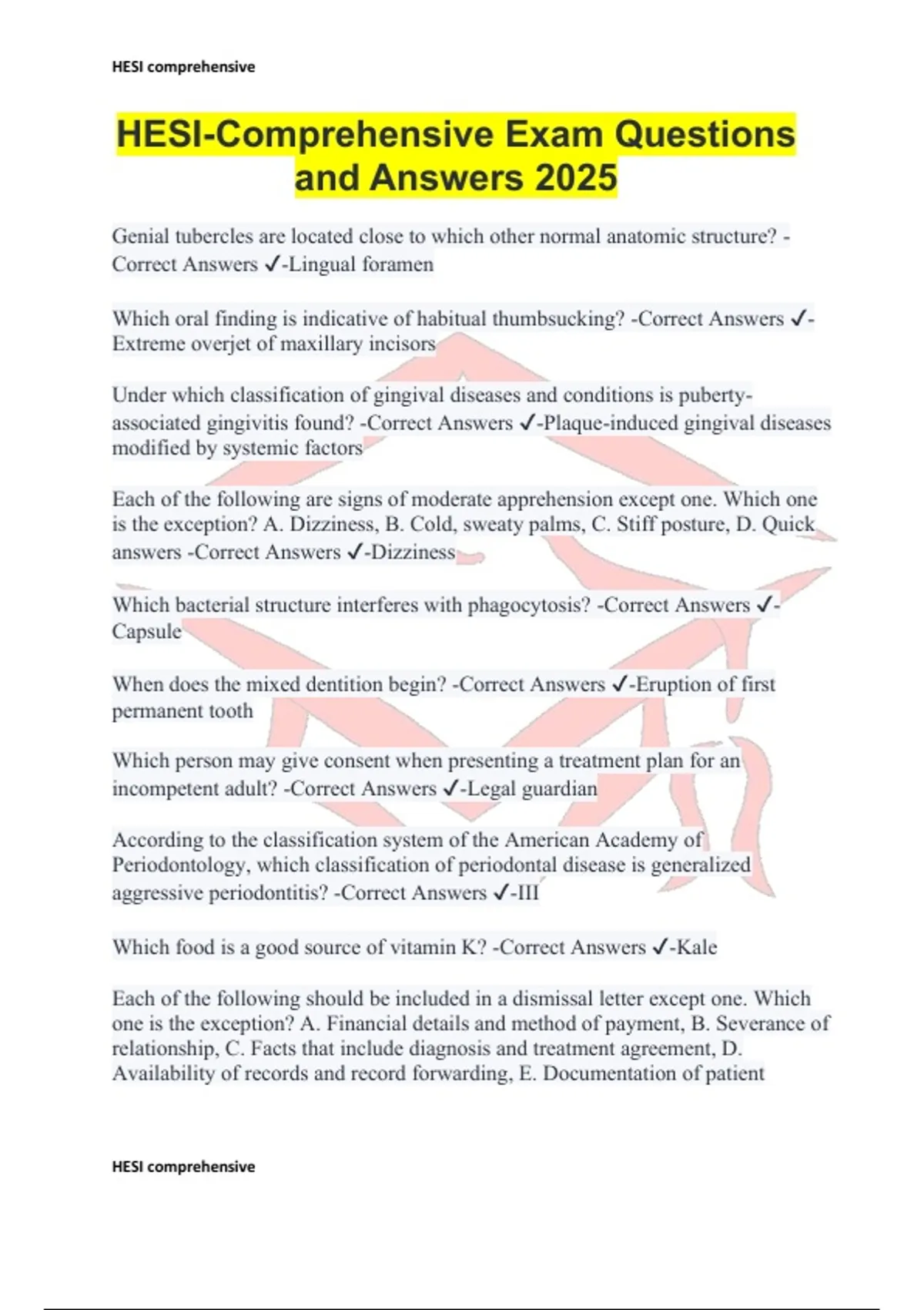 Genial tubercles are located close to which other normal anatomic structure? -Correct Answers -Lingual foramen Which oral finding is indicative of habitual thumbsucking? -Correct Answers -Extreme overjet of maxillary incisors Under which classification of gingival diseases and conditions is puberty-associated gingivitis found? -Correct Answers -Plaque-induced gingival diseases modified by systemic factors Each of the following are signs of moderate apprehension except one. Which one is the exception? A. Dizziness, B. Cold, sweaty palms, C. Stiff posture, D. Quick answers -Correct Answers -Dizziness Which bacterial structure interferes with phagocytosis? -Correct Answers -Capsule When does the mixed dentition begin? -Correct Answers -Eruption of first permanent tooth Which person may give consent when presenting a treatment plan for an incompetent adult? -Correct Answers -Legal guardian According to the classification system of the American Academy of Periodontology, which classification of periodontal disease is generalized aggressive periodontitis? -Correct Answers -III Which food is a good source of vitamin K? -Correct Answers -Kale Each of the following should be included in a dismissal letter except one. Which one is the exception? A. Financial details and method of payment, B. Severance of relationship, C. Facts that include diagnosis and treatment agreement, D. Availability of records and record forwarding, E. Documentation of patient noncompliance in bargain -Correct Answers -A. Financial details and method of payment Mobility is a risk factor for periodontal disease progression. Mobility is measured using bidigital evaluation when teeth are not occluded. -Correct Answers -Both statements are true A dental material's resilience estimates the total elastic energy it can absorb before deformation occurs. A dental material's elastic strain represents its stiffness. -Correct Answers -The first statement is true and the second is false On which periapical imag is the mylohyoid ridge visible? -Correct Answers -Mandibular molar Which ethical principle does informed consent uphold? -Correct Answers -Autonomy Which condition warrants antibiotic premedicaiton? -Correct Answers -Repaired congenital heart disease Periodontal dressings are used to stop gingival bleeding after periodontal surgery. Surgical wounds heal more quickly when protected by a periodontal dressing. -Correct Answers -Both statements are false Which statement indicates teh dental hygienist is making a dental diagnosis? -Correct Answers -"An OTC mouthguard would help relieve your TMJ discomfort Which is not a part of the patient's informed refusal of treatment? -Correct Answers -Dismissal from practice The hepatitis B virus is transmitted through ingestion of foods or water contaminated by an infected person. The hepatitis A virus is transmitted through blood, blood products, or body fluids. -Correct Answers -Both statements are false. Where is chronic atrophic candidiasis most likely found? -Correct Answers -Palate